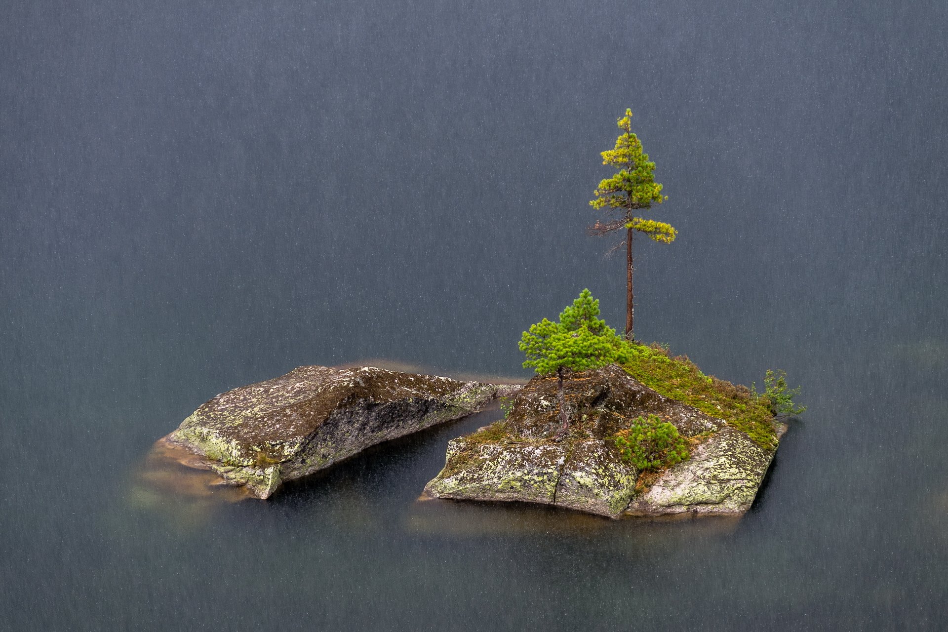Не спеша пройтись вокруг озера Художников, - удовольствие, даже с учетом того, что почти все его берега сплошной курум, сиречь хаотичное нагромождение камней размером от чемодана до грузовика… Я шел навестить свой любимый чудо-остров и, почти дойдя до намеченной точки, понял, что сейчас что-то будет. Вскоре, поверхность озера прямо на глазах превратилась в идеальное зеркало, но то было зеркало Снежной Королевы, холодное и мрачное. Не забывая о съёмке, стал подыскивать, где бы укрыться и вскоре нашел большой нависающий камень. Не заставили себя ждать и первые капли дождя. Сначала это были действительно капли, но потом где-то наверху, вентиль крутанули от души… Дождь хлестал без пощады, иногда лишь чуть притормаживая, а я, сидя в относительной сухости, позволял себе даже такую роскошь, как смена оптики. Как ни странно, но островок за стеной ливня не потерялся, - потерялось ощущение реальности, - вся картина приобрела какой-то немыслимый перламутровый оттенок, с реальностью мало совместимый. Вскоре потоками, стекающими по камню, потихоньку стало заливать и меня, но, видимо, наверху запасы воды тоже не безграничны, - вентиль крутанули обратно, ливень кончился…