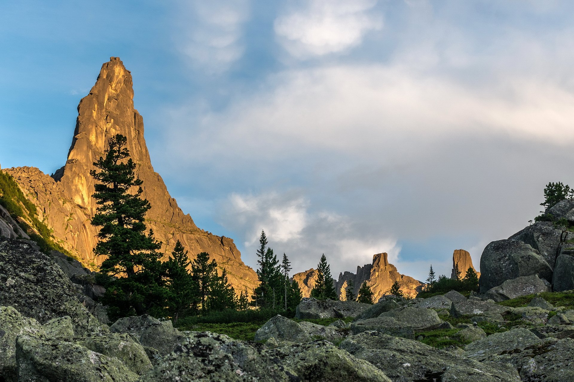 Впервые увидев вблизи пик Звёздный, я был поражен, - гигантский каменный треугольник вогнутым парусом взмывал вверх и, несмотря на размеры, выглядел изящным и невесомым. Даже зная, что за видимой частью сотни метров скал, не проходило ощущение плоской конструкции, поставленной на ребро. Подтверждая название, всем своим видом он был устремлён вверх к солнцу и звёздам. Растущий рядом кедр был ещё не стар, но на своём кедровом веку повидал уже не мало. Для меня он стал просто подарком судьбы, ибо своим изгибом повторял парус Звёздного. Вызывало опасение лишь одно, - найдётся ли нужная точка, чтобы вписать его в контур пика. Однако Горные Духи, видимо, были ко мне благосклонны, - и нужный ракурс нашелся и заходящее солнце золота не пожалело. - Место съёмки: Красноярский Край. Западный Саян. Природный парк Ергаки.