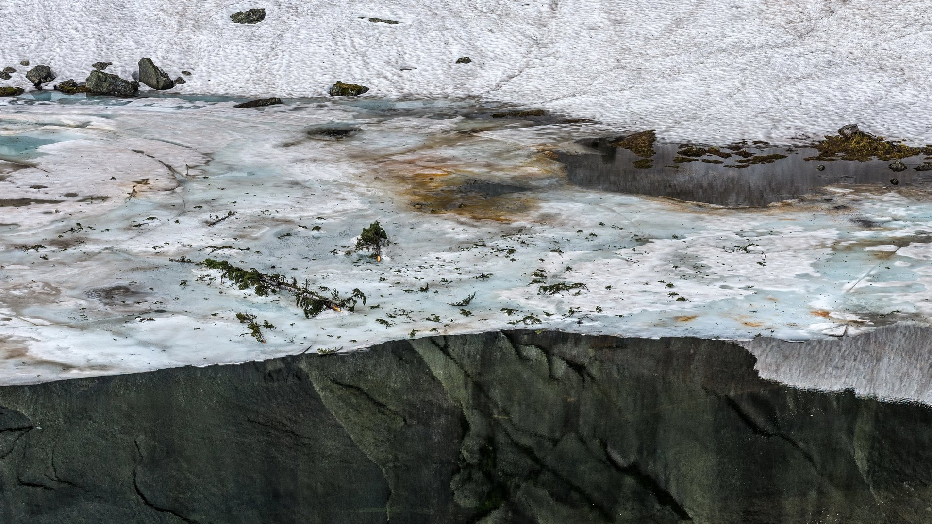 Чёрным озеро зря не назовут… Черное озеро в Ергаках не исключение, - прижатое к вертикальной стене и не избалованное солнцем, оно полностью оправдывало своё название. Однако сейчас, в середине лета, его вполне можно было назвать «Черно-Белым», - та часть, что ближе к скале всё ещё пребывала подо льдом и снегом. Я вышел к его берегу когда заходящее солнце решило его слегка побаловать. Под его мягкими лучами озеро успокоилось и обернувшись зеркалом принялось отражать чёрные скалы одноимённой горы. И тут случилось чудо, - глаз перестал различать где скала, где отражение, - озера не стало, а льды, закрывающие его дальнюю часть, повисли между небом и землёй, словно не весили ровным счётом ничего...