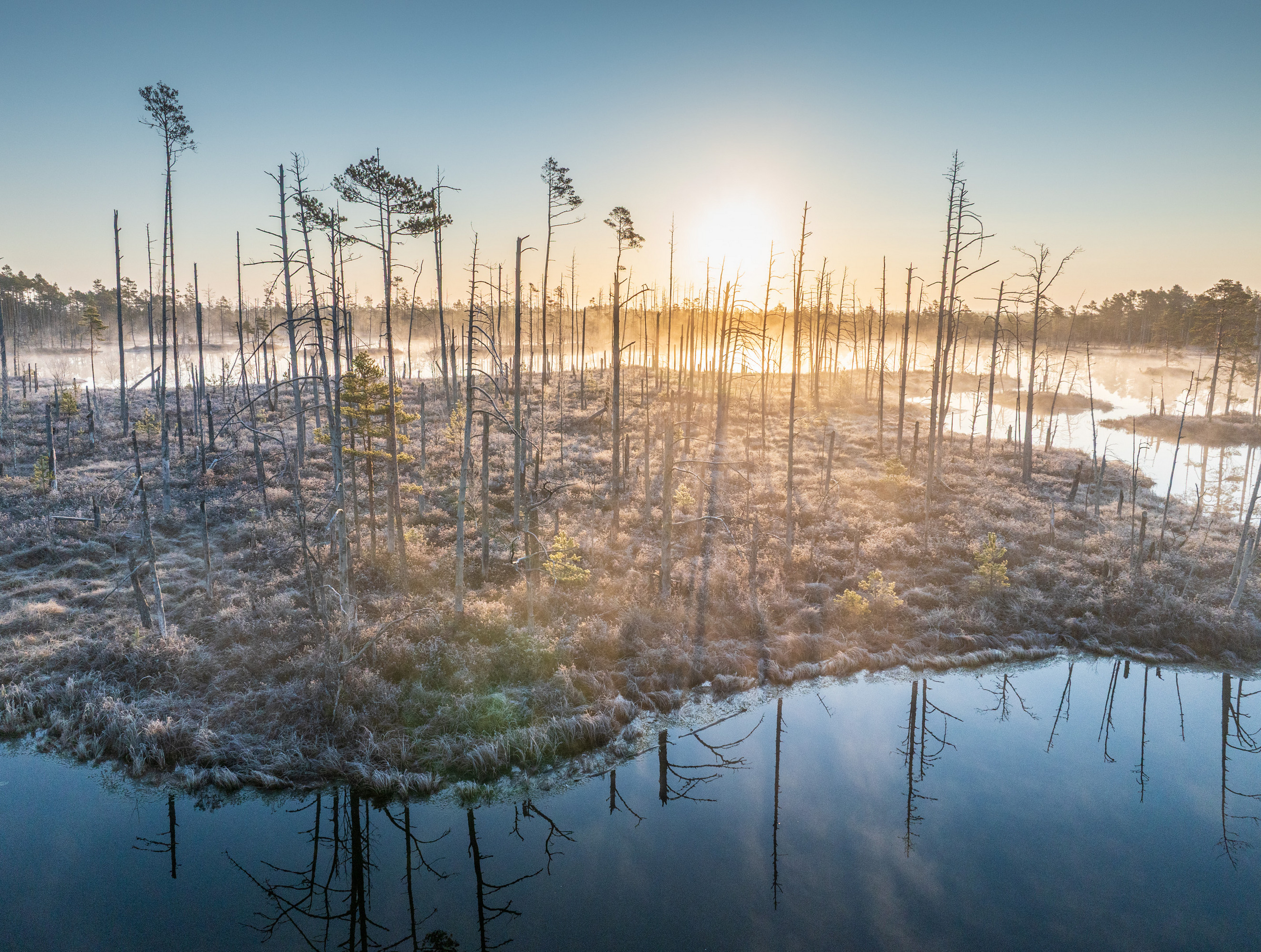 Свет рассвета ложится на мёрзлую тундру с точностью — он не просто освещает, а выделяет контуры стволов, подчёркивает хрупкость растительности. Отражение в воде усиливает ощущение симметрии и устойчивости.