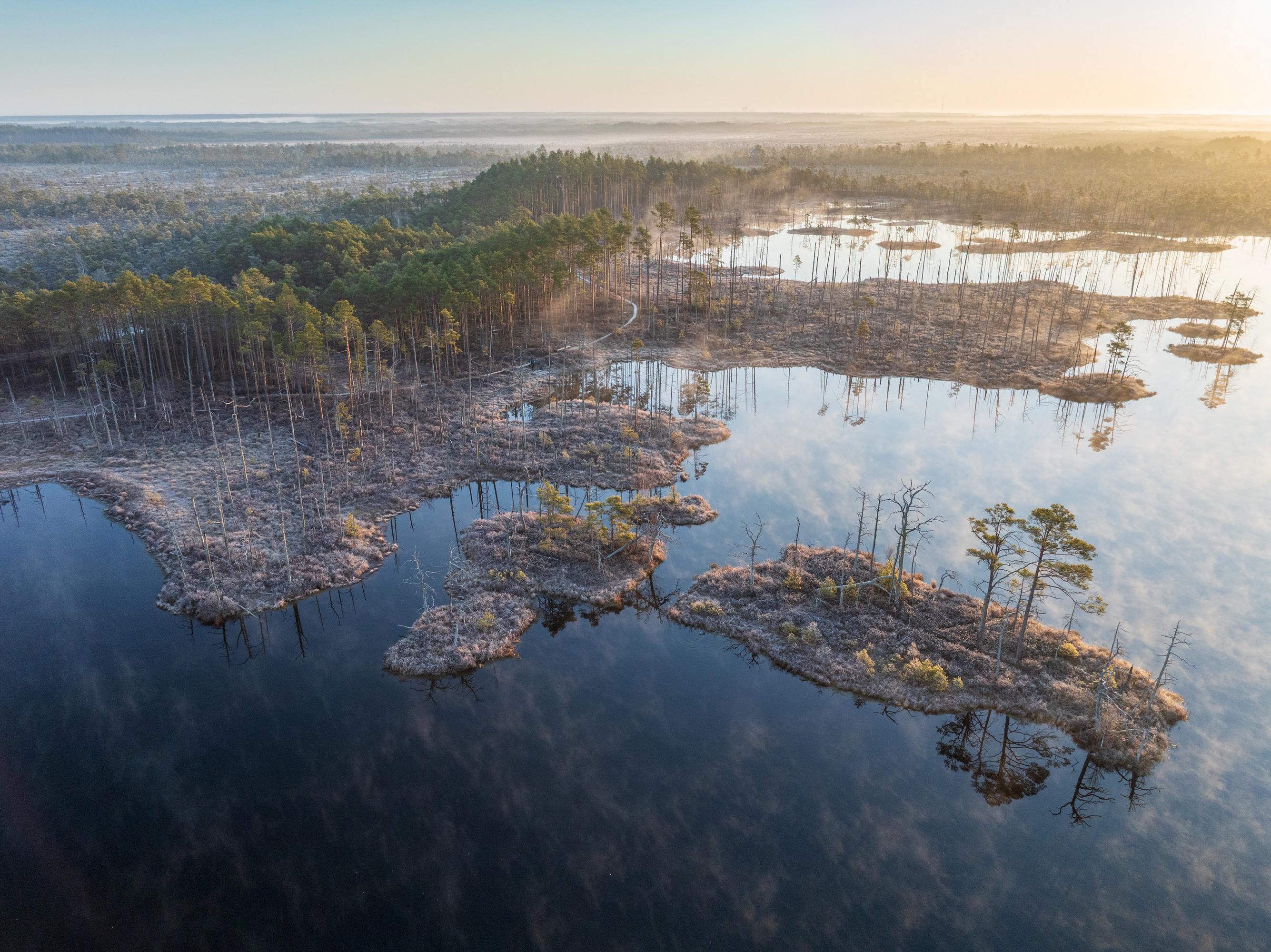 На этом изображении запечатлено удивительное природное явление — туманное утро в болотистой местности. Вода спокойна как зеркало, отражая силуэты деревьев и островков, покрытых густым туманом. Этот момент передает ощущение тишины и умиротворения природы ранним утром.