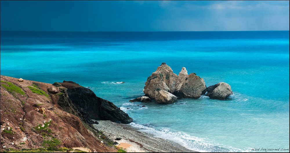 Эту фотографию мы сделали вблизи места, где, по преданию, родилась Афродита. Мы гнали машину в полосе дождя от Пафоса к Лимассолу. В какой-то момент мы его обогнали и ворвались в полосу солнца. И тут море заиграло! Срочно свернули с дороги, остановили машину и пока все не прошло на бешеном ветру сделали несколько снимков.
