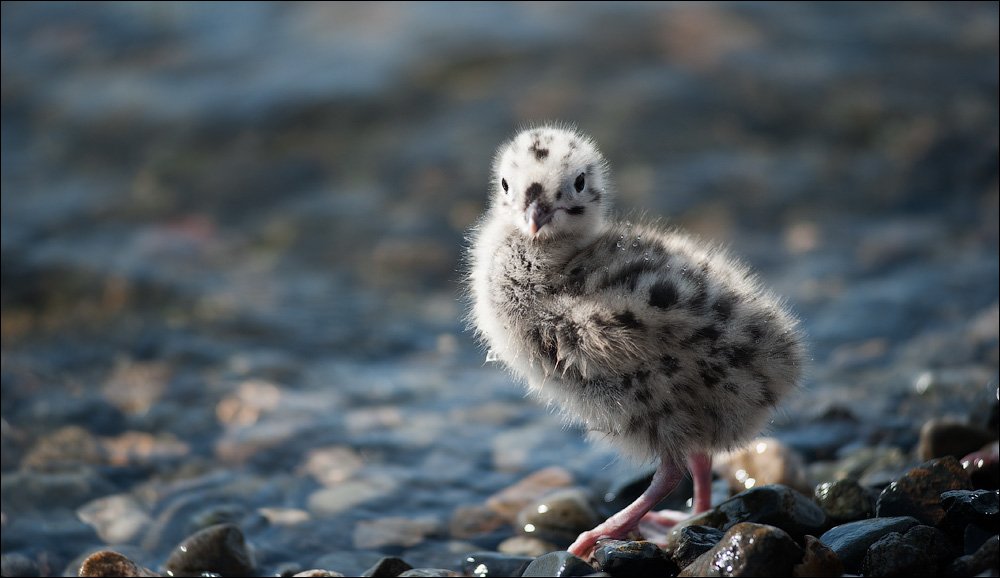 Огляделся вокруг. У меня из-под ног выскочил пушистый комочек леопардового цвета. Так вот в чем причина чаечных волнений! Чаечный цыпленок! Я привык, что чайчики выглядят также, как и взрослые чайки - белые и красивые. Маленькие - они тоже симпатичные: пушистые, хорошо плавают и на чайку похожи только забавным попугаичьим клювом.