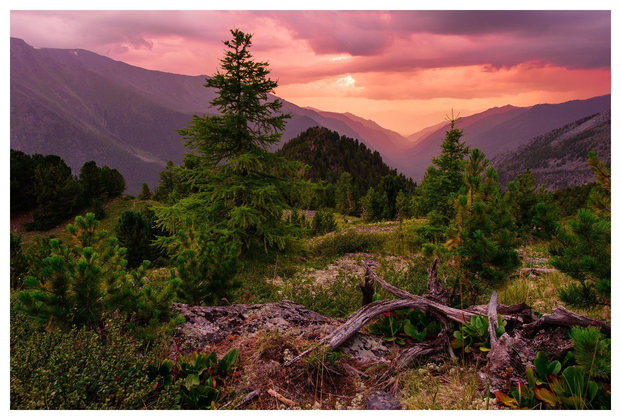 Со стороны хребта Кара-тюрек (там где стоит ГМС) надвигались тёмные тучи из которых уже лились на землю тёмные струи дождя. Сразу после того как догорели последние краски заката я поспешил по верхней конной тропе вниз к кедровой стоянке в верховьях реки Текелюшка: там стояла наша группа. На следующий день нас ждал переход через перевал.