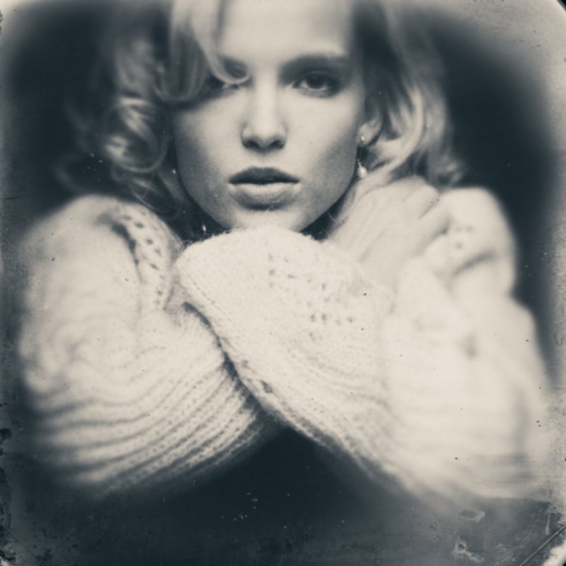 фотография притворяеца амбротипией. плюс на мой взгляд девушке тесно в этом квадрате. ощущение что ее как будто упаковали , ей тесно , поэтому такое положение рук.