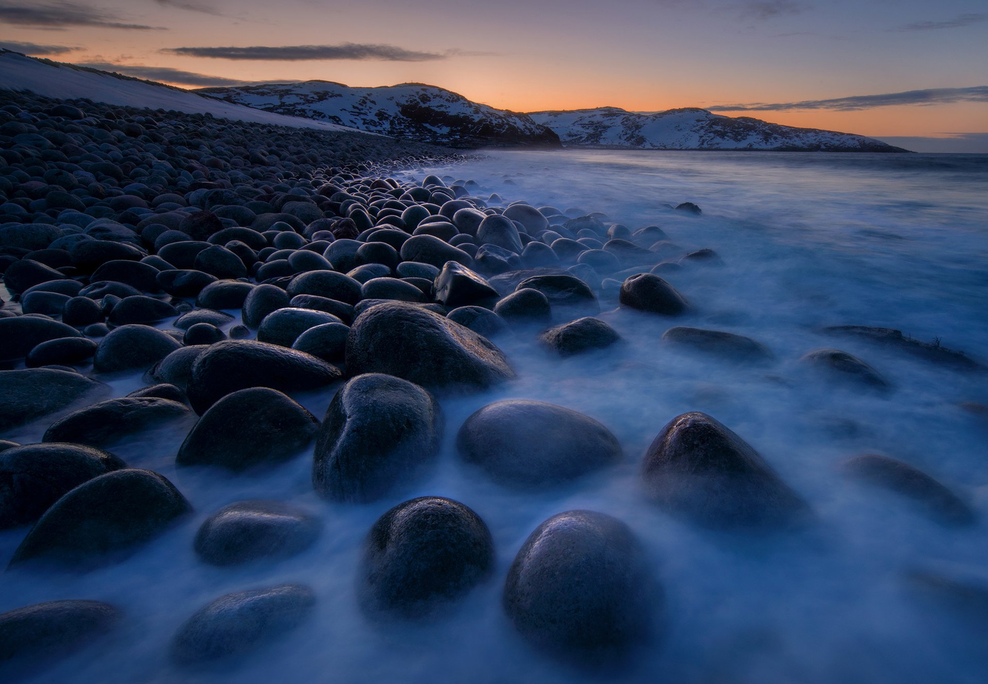 Мурманская область, Кольский полуостров, Баренцево море, зима. Этот снимок я делал, стоя по колено в воде в бурлящем Баренцевом море во время прилива. Отдыхайте на пляжах Заполярья!