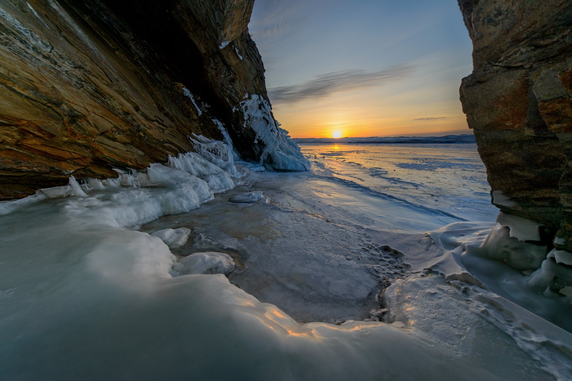 Байкал, Малое Море. Ранее утро, вид на восходящее солнце из грота у мыса Уюга. Грот - огромный, тёмный, чтобы подсветить его, я использовал пару внешних вспышек, которые расставил по углам.