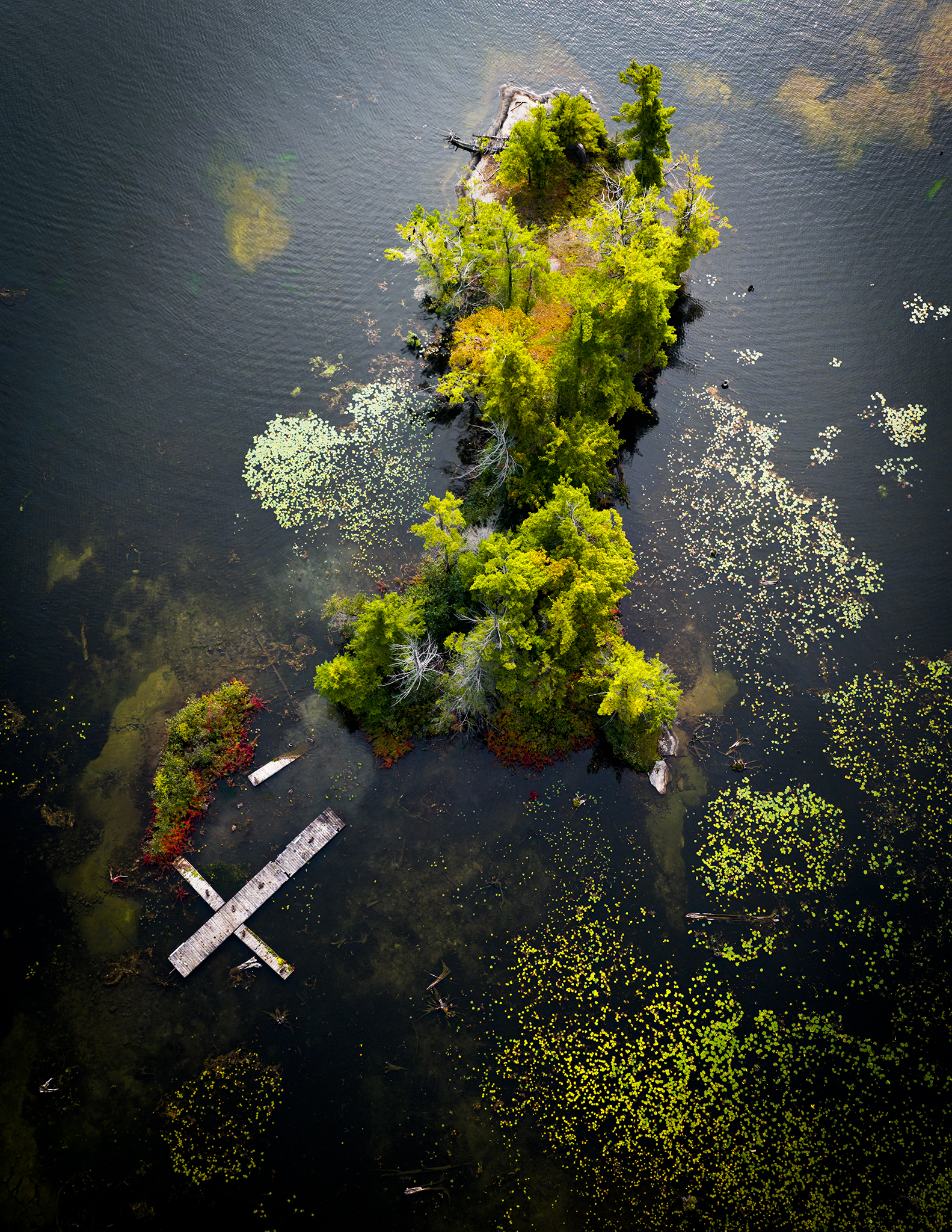Strong aerial composition — the island stands out sharply against dark, textured water. The cross-shaped dock adds a striking geometric contrast to the organic shapes. Rich greens and subtle algae patterns give depth and texture. The image feels quiet, grounded, and visually balanced.