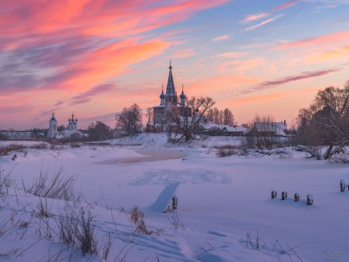 121"Русская зима на рассвете у старых мостков через реку Теза" |  102"Жар-птица в Холуе" |  99"Апрельская панорама разлива на реке Теза на восходе солнца" |  95Утренние сумерки у стен Благовещенского монастыря в Дунилове |