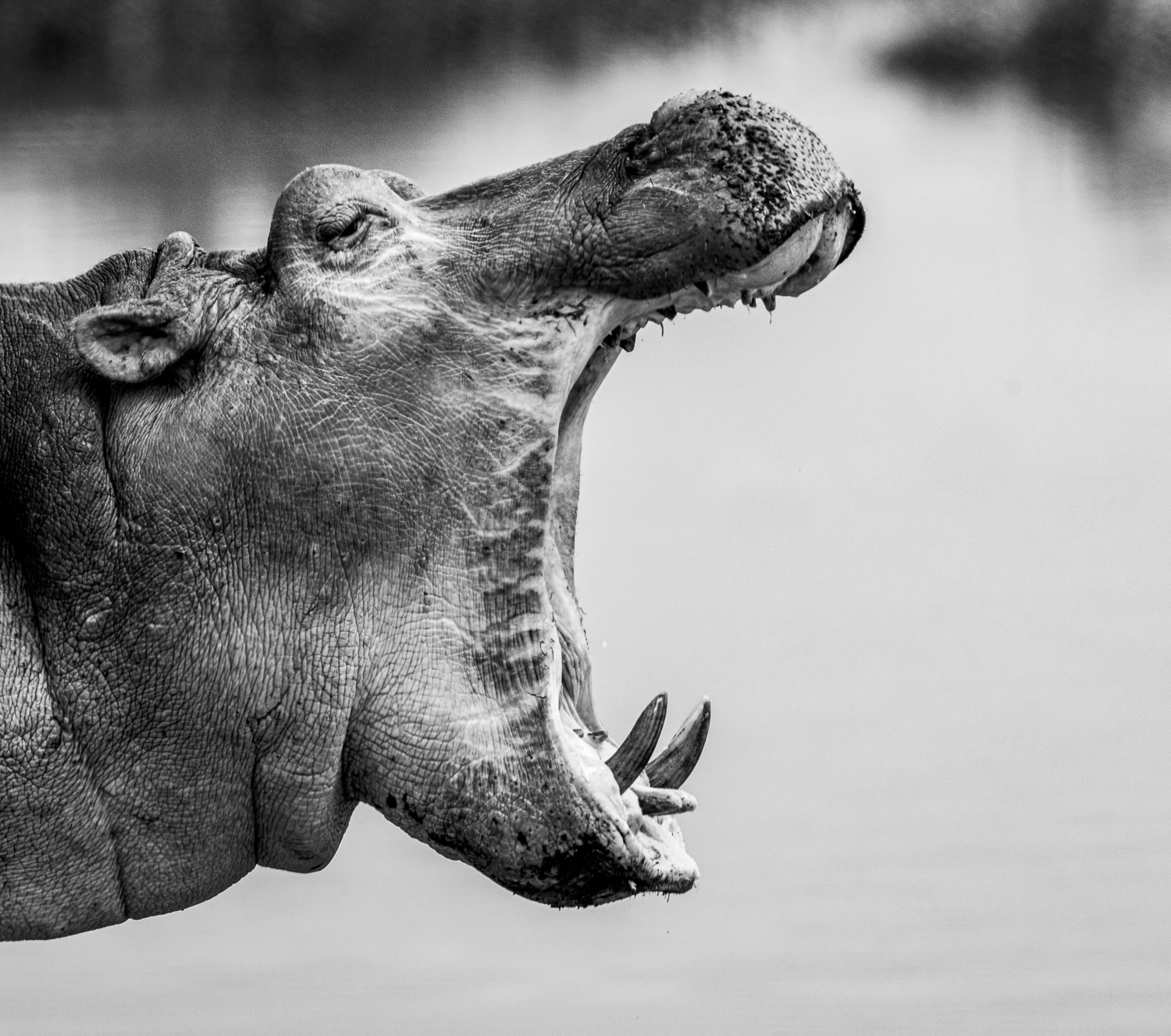 Hippo’s wide yawn — raw, unfiltered. The texture of the skin, the curve of the jaw, the teeth — all sharp and real. Water blurred behind, focus tight on the moment. Good framing.