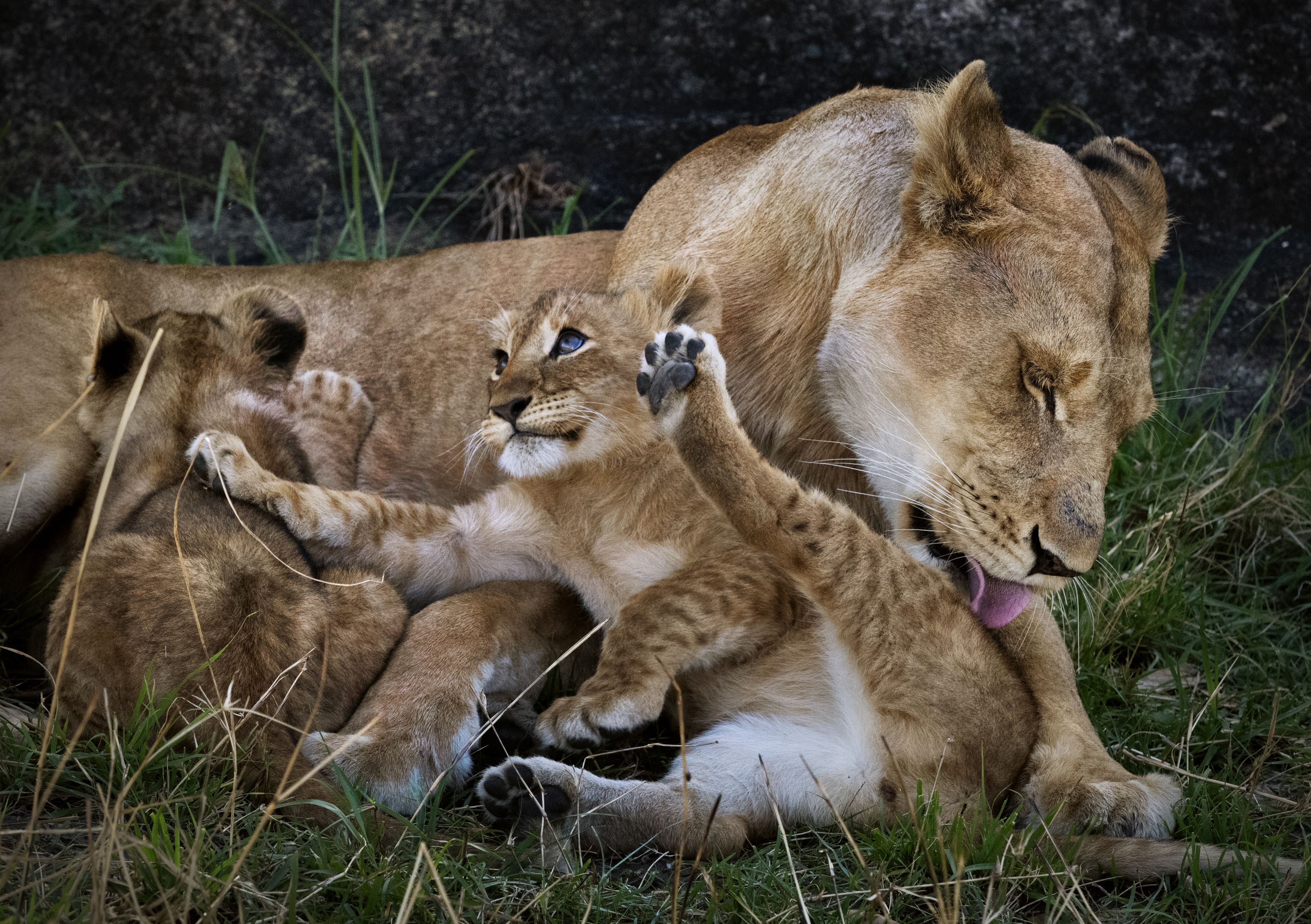Lioness lying in grass, grooming a cub that playfully reaches up with its paw. Another cub rests beside them. The lighting is natural, shadows soft. The composition is tight, focusing on the interaction. The expression of the lioness is calm, the cub’s eyes alert. Grass and rock in the background add texture without distraction.