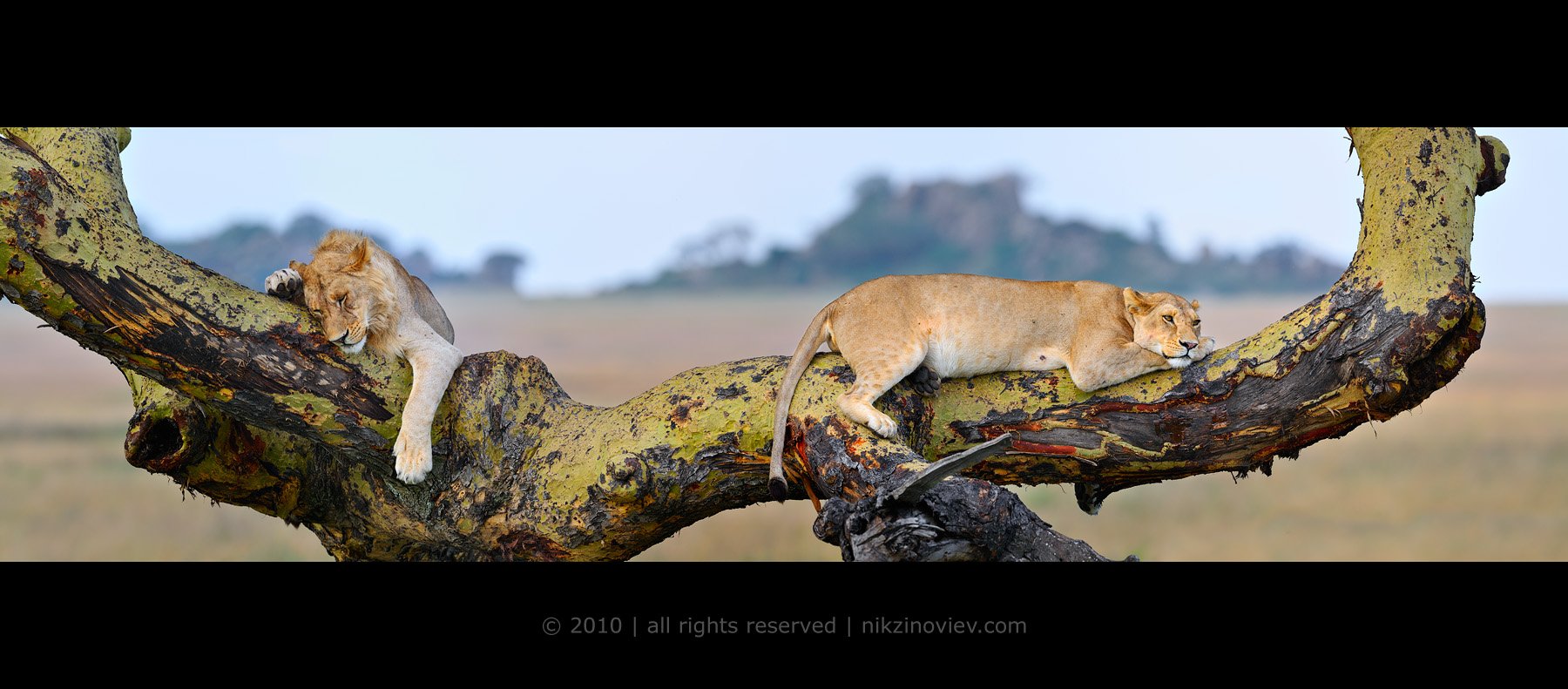 Взрослые самцы практически никогда не поднимаются на деревья, а самки очень любят отдыхать в кронах деревьев в любом возрасте. Молодой лев и опытная львица закрутили роман. После жарких сцен любви на земле, усталый и изнеможденный молодой лев последовал за подругой на дерево, и после нескольких минут уснул крепким сном.