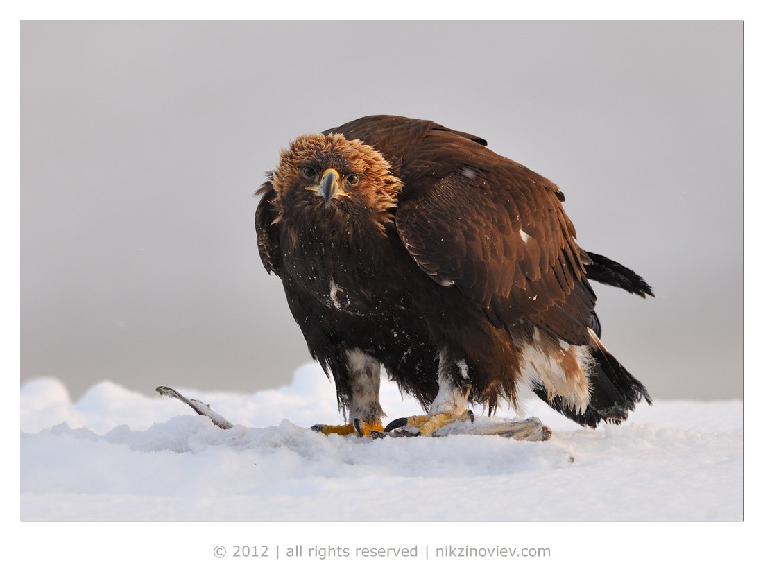 На морозе беркуты очень красивы, на мой взгляд. Оперенье на голове и шее становится колом и при хорошем утреннем освещении это головное убранство особо выделяется. Кадр снят с первым светом из скрадка на берегу Курильского озера, что на Камчатке ...