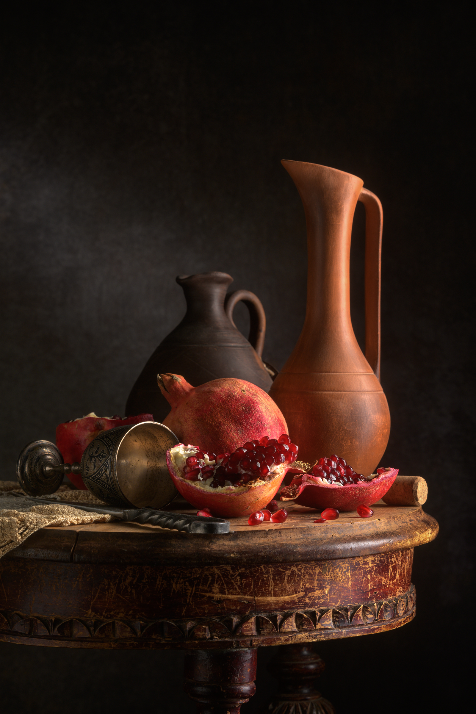 На изображении — классический натюрморт с гранатами, раскрытыми на столе, рядом с глиняными кувшинами и медным кубком. Тёмный фон и направленный свет создают драматическую атмосферу, подчёркивая текстуры и объёмы предметов. Композиция передаёт ощущение уюта и вечности, характерное для традиционных натюрмортов. Фотография выполнена с высокой степенью детализации и глубиной цвета.