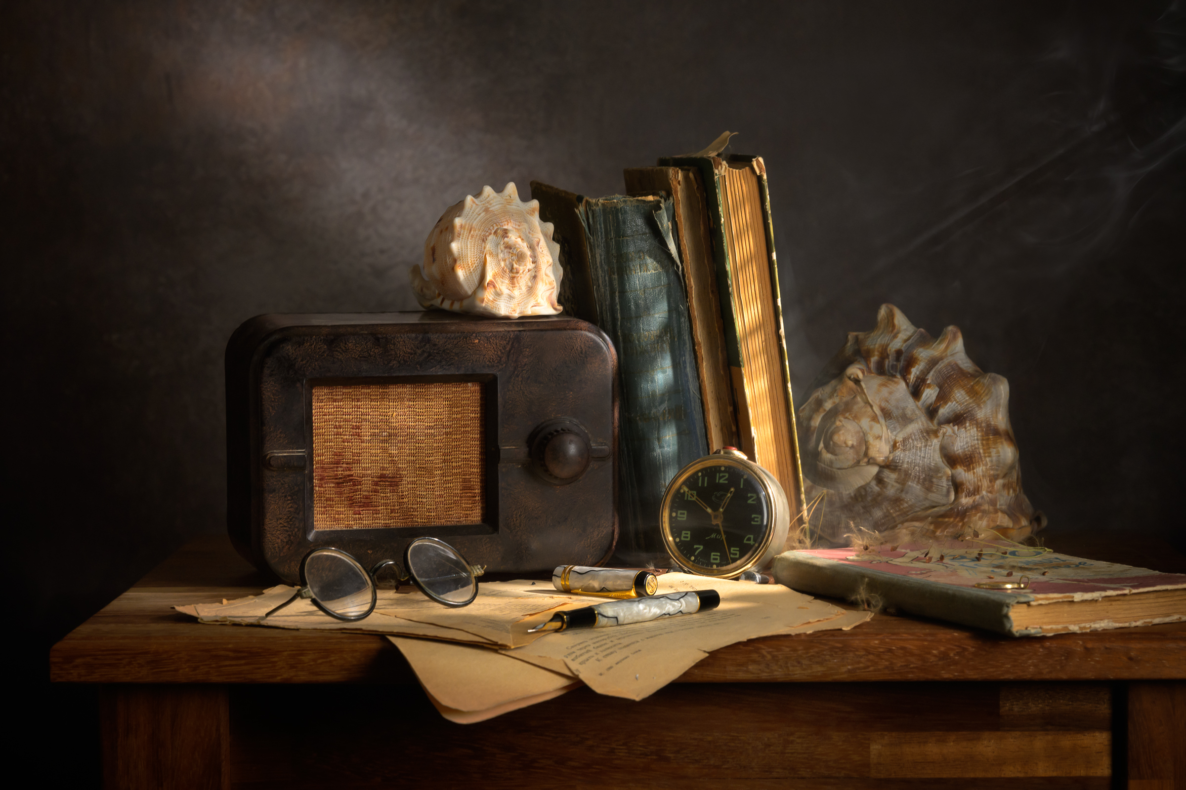 Вы создали атмосферу, где время остановилось — старинный радиоприёмник, потрёпанные книги, морские раковины, часы и письменные принадлежности словно вспоминают прошлое. Композиция уравновешена, свет мягко подчёркивает текстуры, а тёмный фон усиливает ощущение уюта и задумчивости. Сильная сторона — глубина и настроение, словно в кадре застыл момент из жизни, полный истории.