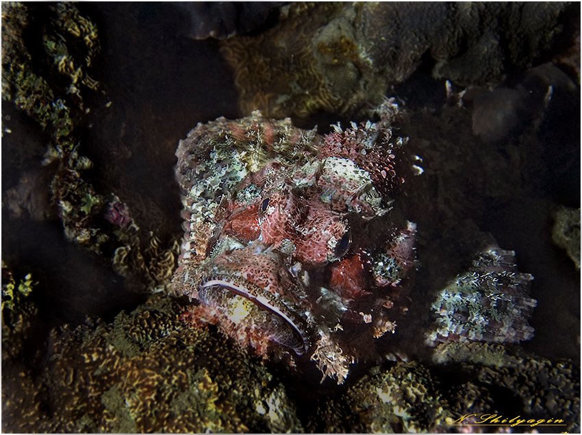 Египет, ночное погружение на домашнем рифе. Народу то есть дайверов много и попробуй тут найди скорпену замаскироанную. Только бади помогла (жена конечно).