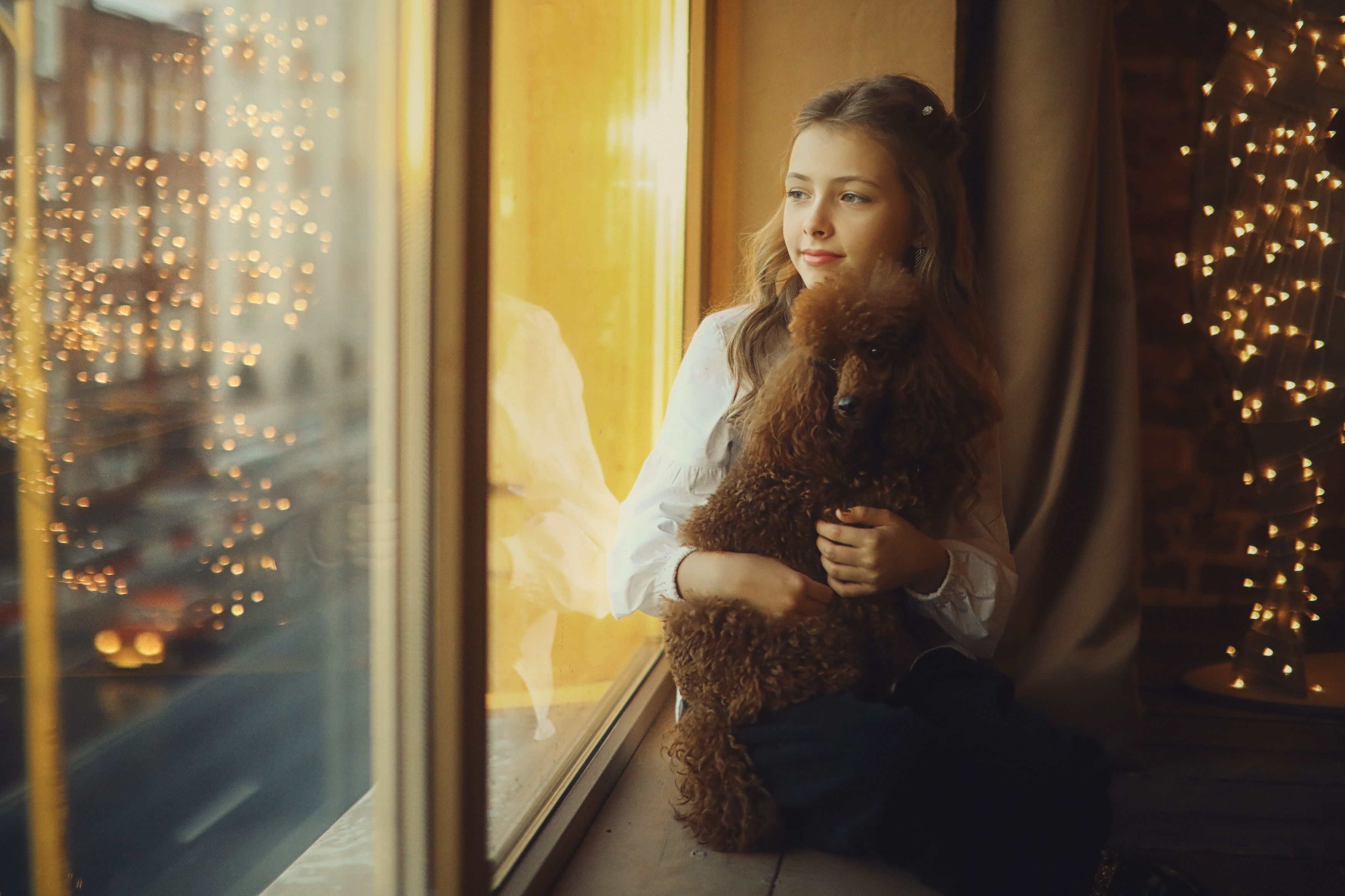 I love poodles and the pretty girl enjoying a cuddle adds to effect of the photo. I think the poor dog could do with a good trim. A bit of contrast with the background would add to the effect.