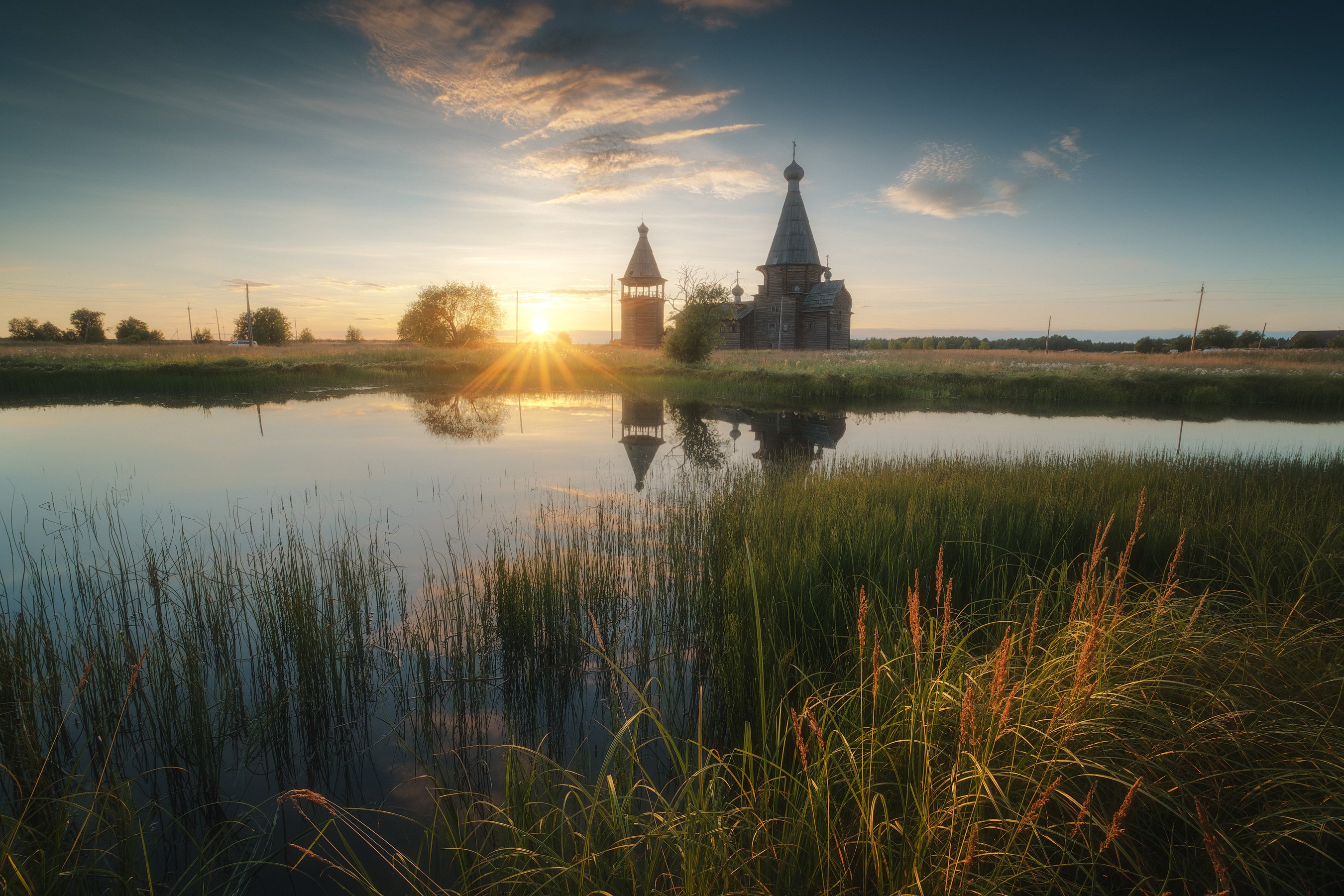 россия, архангельская область, русский север, кенозеро, кенозерье, национальный парк, пейзаж, природа, церковь, озеро, саунино, закат, луг, лето, сенокос, Оборотов Алексей