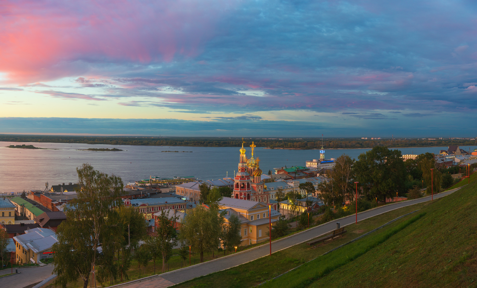 нижний новгород, парк 800-летия нижнего новгорода, набережная фёдоровского, рождественская улица, церковь собора пресвятой богородицы, вечер, закат, подсветка, Денисевич Алексей