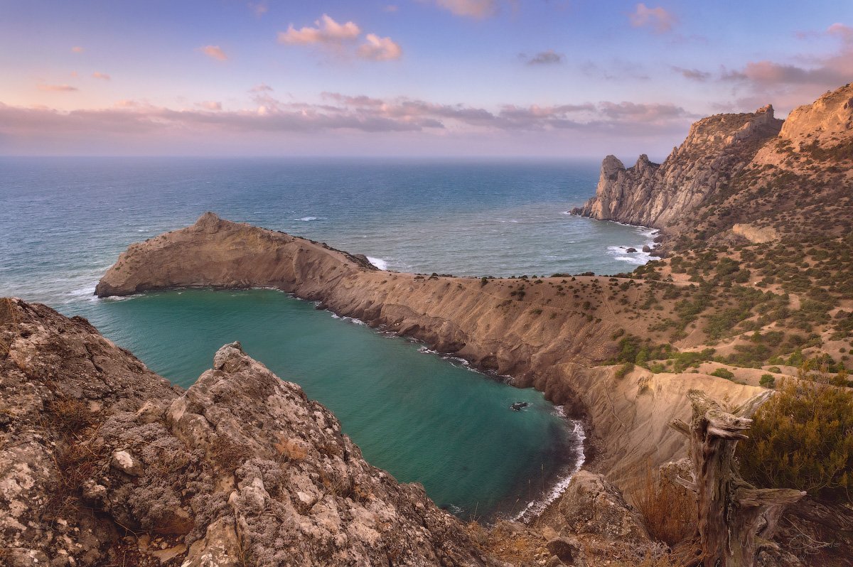 В один из дней фототура приехали в природный заказник "Новый Свет". Поднялись на скалистую гору Коба-Кая или Орел. Высота всего 165 м. Но сразу почувствовали не воробьиный нрав.. )) Задувал такой ветрила, что пару раз на открытых участках была угроза совершить полет к морю ... Даже рюкзак не спасал за спиной ... А так хотелось побыть там подольше... Виды и воздух потрясающие! Сосны, реликтовый можжевельник! Впереди мыс Капчик и скала Космос! Внизу вдоль морского побережья проходит тропа с гротами князя Галицина. Говорят, что на одном из склонов горы Коба-Кая снимали некоторые сцены фильма "Человек-Амфибия"! Душевный такой, эстетичный уголок! )