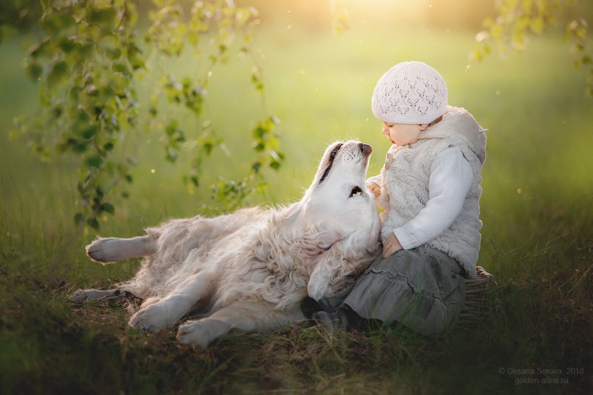 собака, белая собака, ретривер, голден, лето, лес, свет, солнце, ребенок, дружба, счастье, радость, ребенок и собака, Оксана Серова