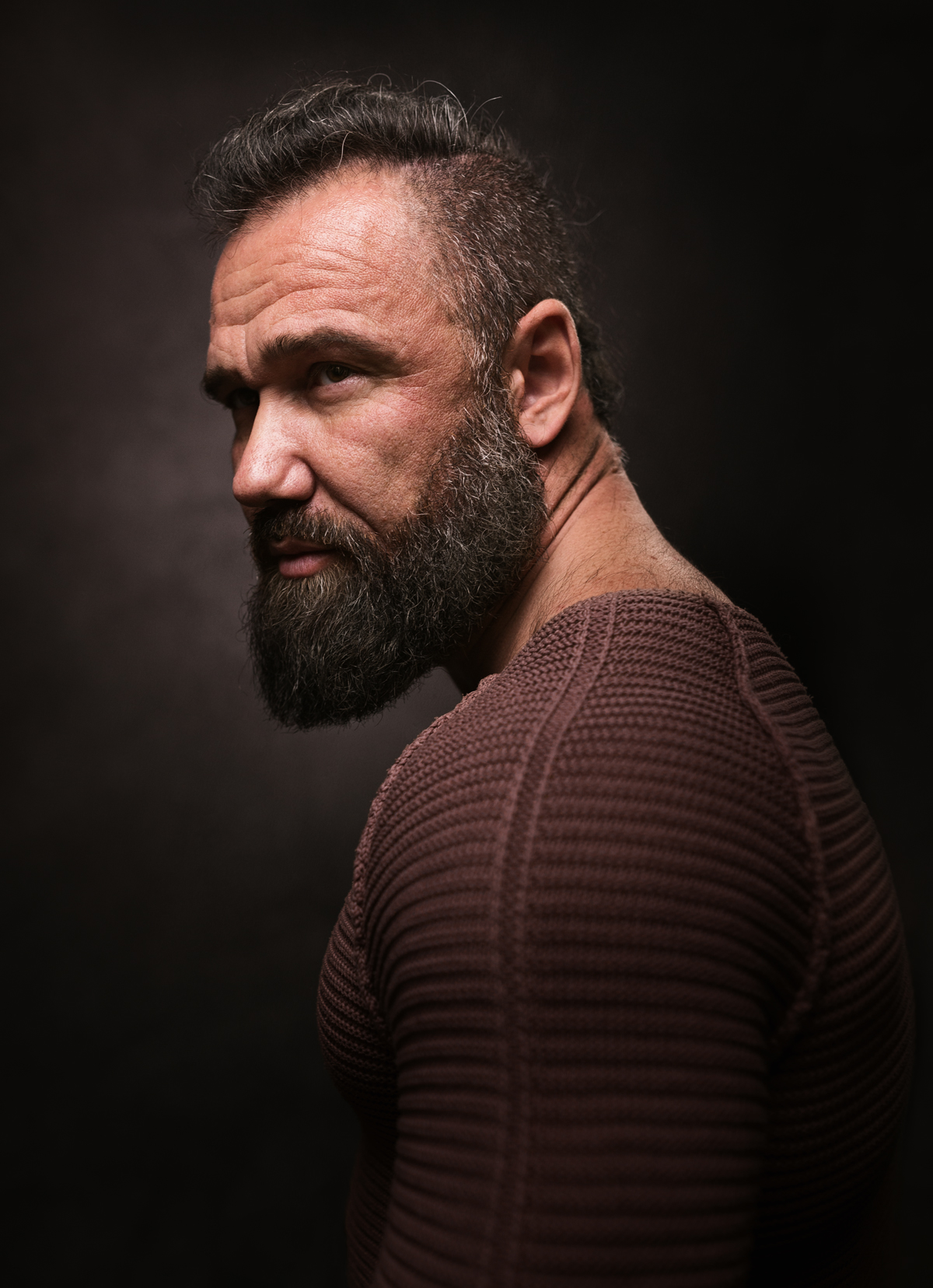 Снимок выразительный — свет играет на текстуре одежды и лица, создаёт объём. Лицо мужчины говорит само за себя: взгляд, борода, поза — всё работает на характер.