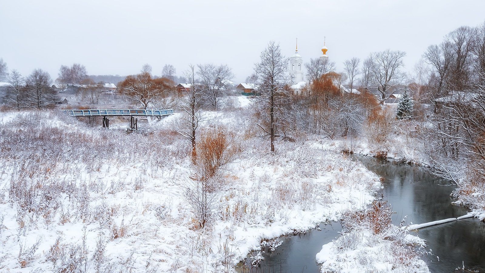 ноябрь, снег, осень, река, церковь, мост, Олег Белый