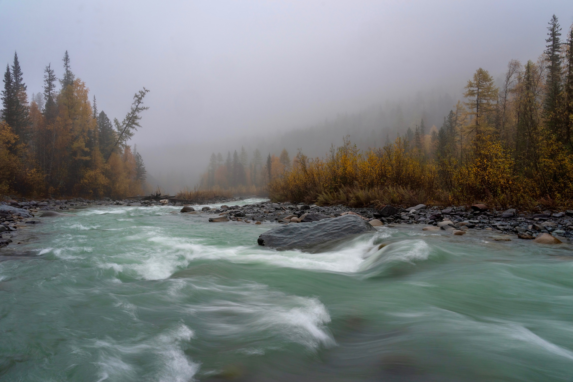 Вы получили неплохой снимок — река с турбулентным течением, холодная палитра, туман в верхней части кадра, осенние оттенки в растительности. Структура кадра устойчива, движение воды передано мягко, без переборов. 🌲💧