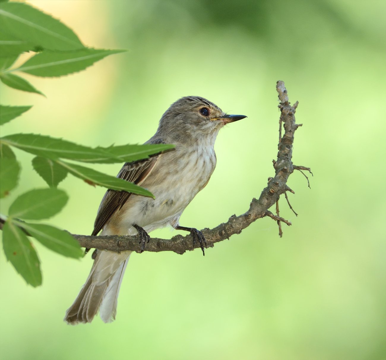 Серая мухоловка неброской окраски птица с длинными крыльями и хвостом. Взрослые птицы имеют серое, либо серо-бурое оперение. Брюхо светлое со слабыми, тёмными штрихами. Лапки короткие и темноватые, как и клюв. Птенцы более бурого цвета, чем взрослые птицы. Песня тихая с резкими звуками «петь», «тсить».