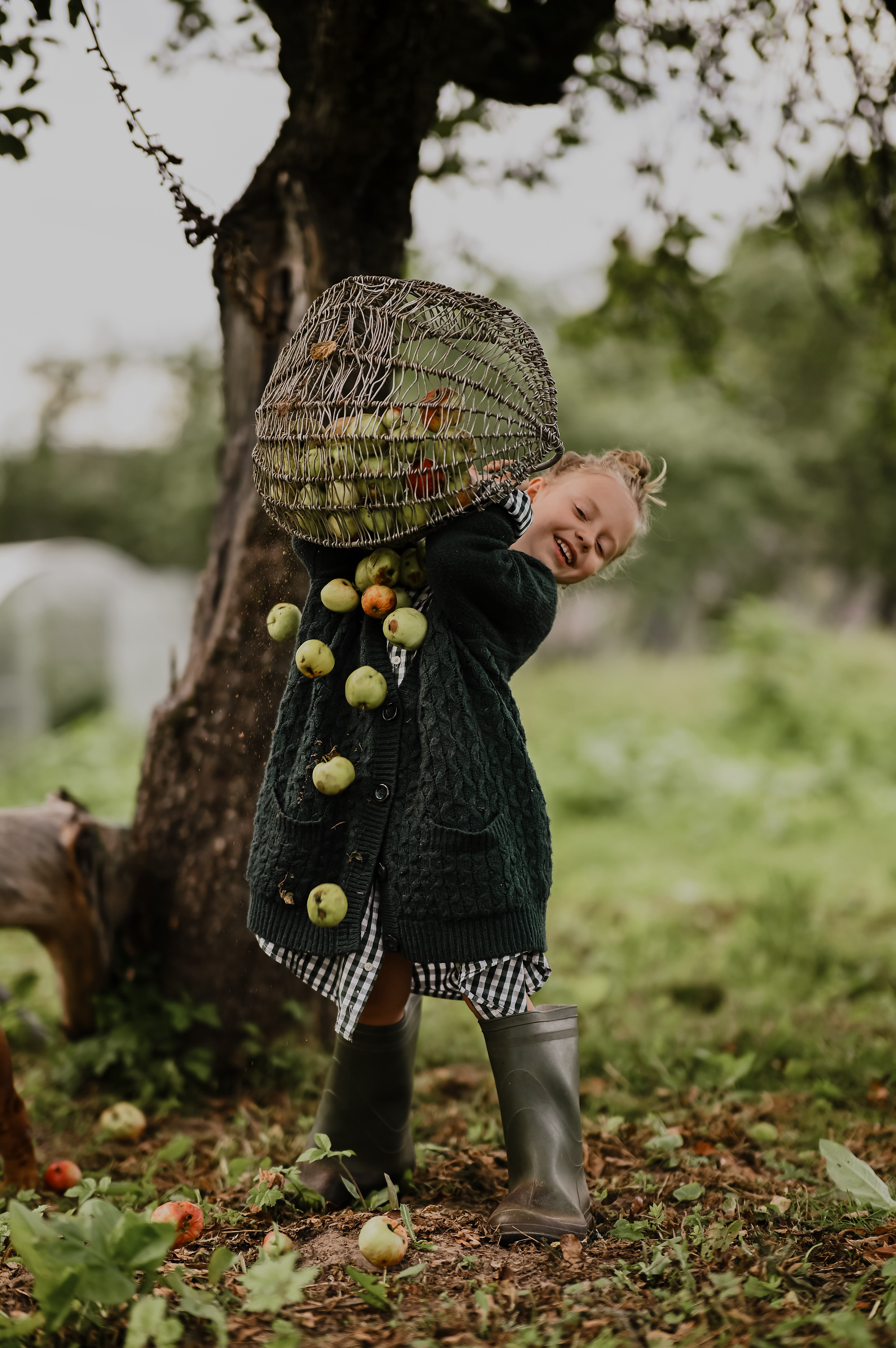 Олеся, как живой снимок из сказки — ребёнок с корзиной яблок, словно вышедший из старинного альбома, и всё вокруг — природа, свет, движение — чувствуется тёплый, искренний момент.