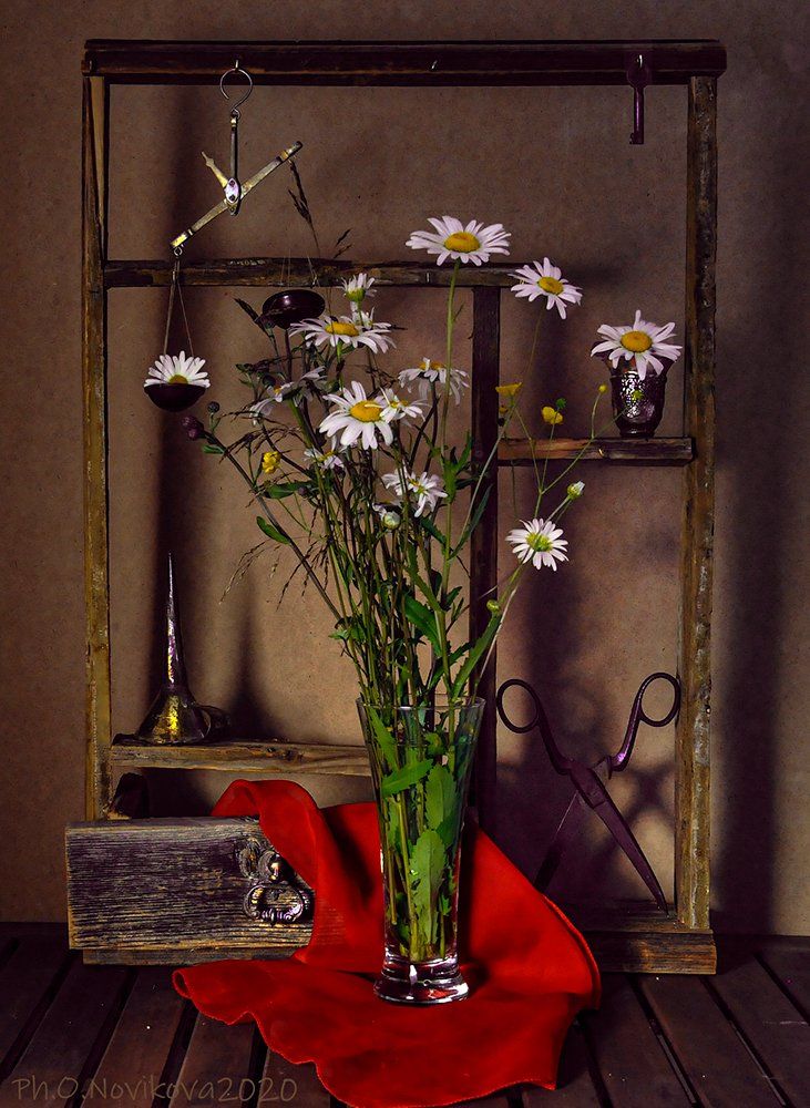 полка,ромашки,цветы,платок,ножницы,весы, Ольга Новикова