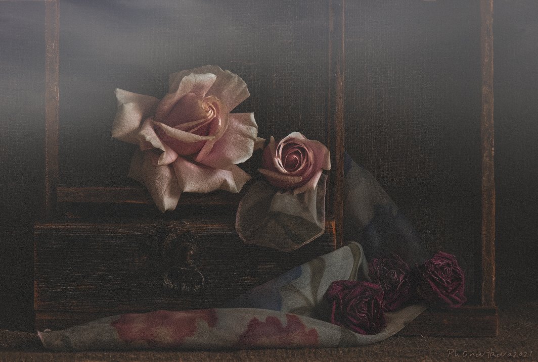 некоторые пытаются "раздербанить" натюрморт по правилам, по сочетанию структур тканей , в одном кадре увядших роз и свежих и пр., потому вариантов обработки много и потом приходишь к той, которую хочется показать!