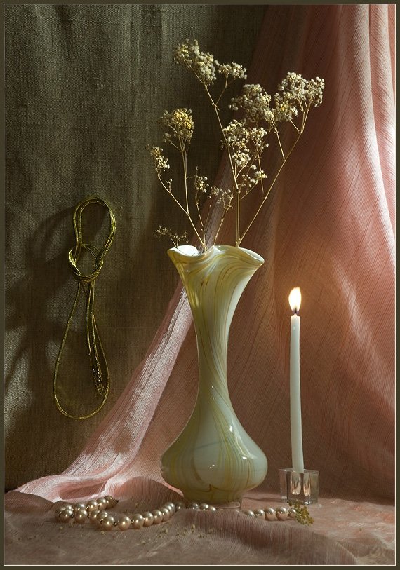 Нравится фон и цвет его, но и только. Потомучто он получился приятным и ФАКТУРНЫМ. Свет лег хорошо и сделал его объемным. И петля получилась очень выразительно, а вот ваза, цветок и свеча получились плоскими, т. к свет на них нормально не лёг. Вернее тот свет который попал на вазу получился пятнами.