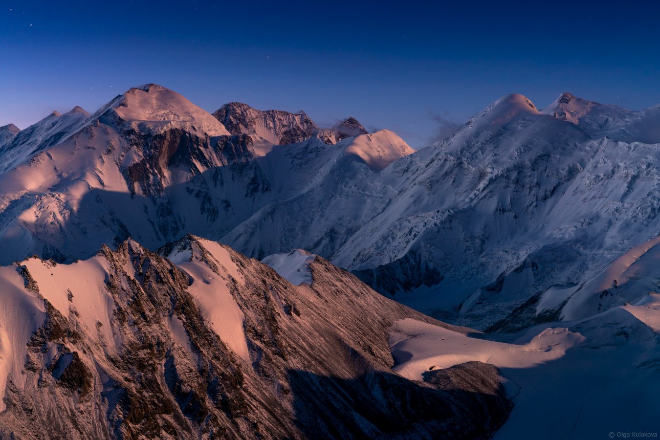 Слева направо: пик Мраморная Стена, пик РГО, пик Пржевальского, пик Карлытау, пик Казахстан, пик Шатер Восточный