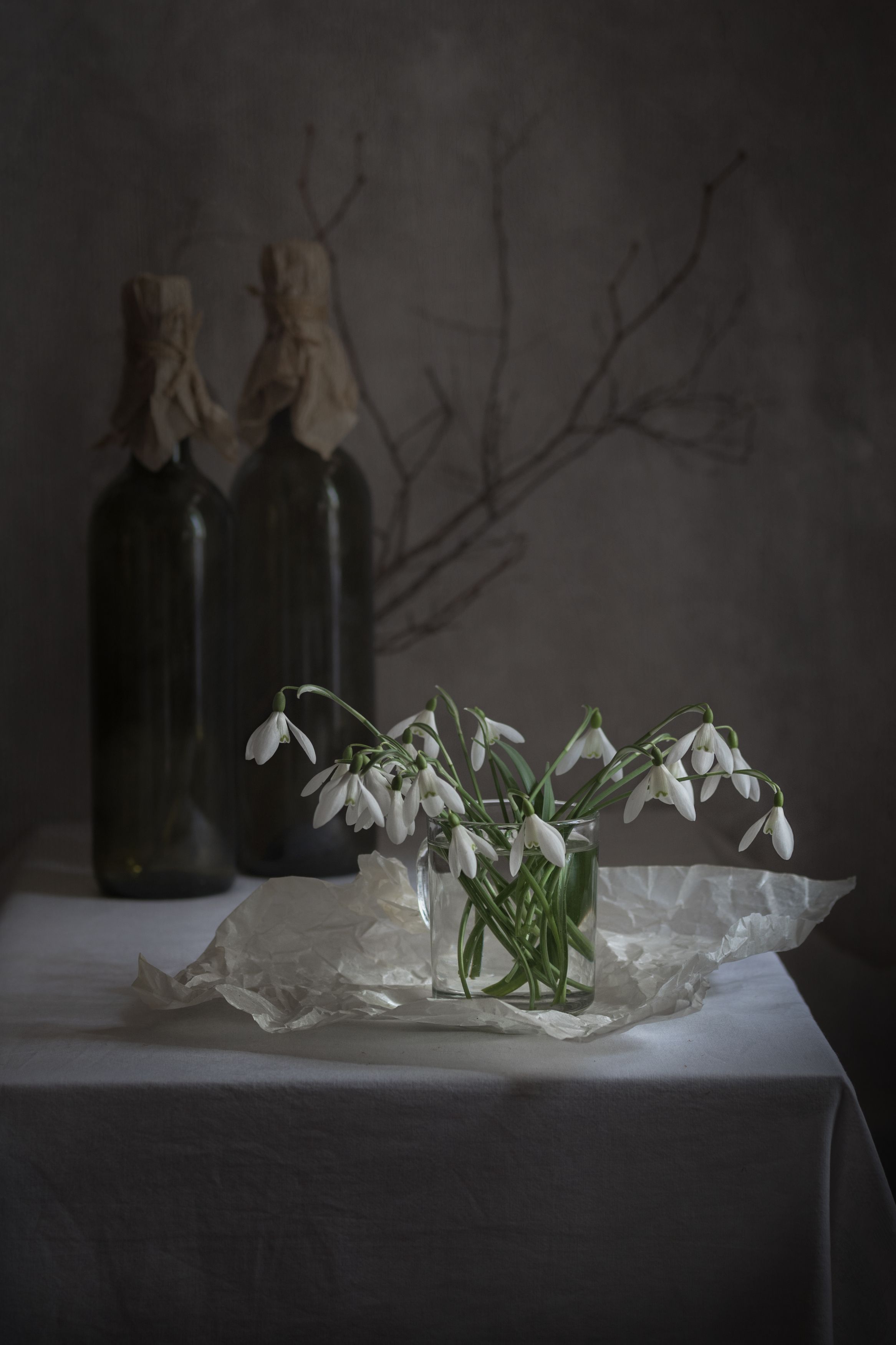 В тихом, почти монотонном пространстве натюрморта — белые подснежники, как первые признаки весны, контрастируют с тёмными бутылками и сухими ветвями. Свет, падающий сбоку, подчёркивает хрупкость цветов, придавая сцене лирическую грусть и надежду. Работа Елены Рубинской передаёт атмосферу тихого ожидания, когда зима уступает место пробуждению природы.