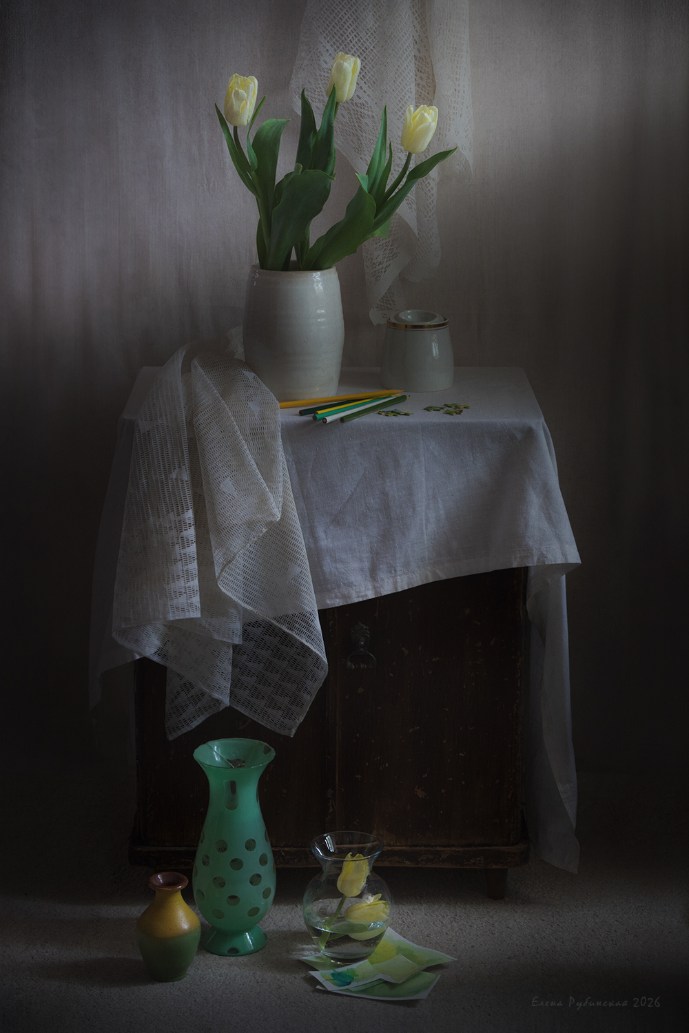 Фотография выстроена с вниманием к деталям: ткань, вазы, цветы — всё находится в гармоничном балансе света и тени. Выбор белых тюльпанов в сочетании с тёплыми тонами керамики создаёт ощущение спокойствия и уюта.