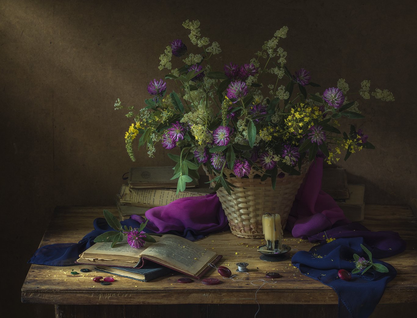 натюрморт,лето,букет,книги,клевер, Елена Рубинская