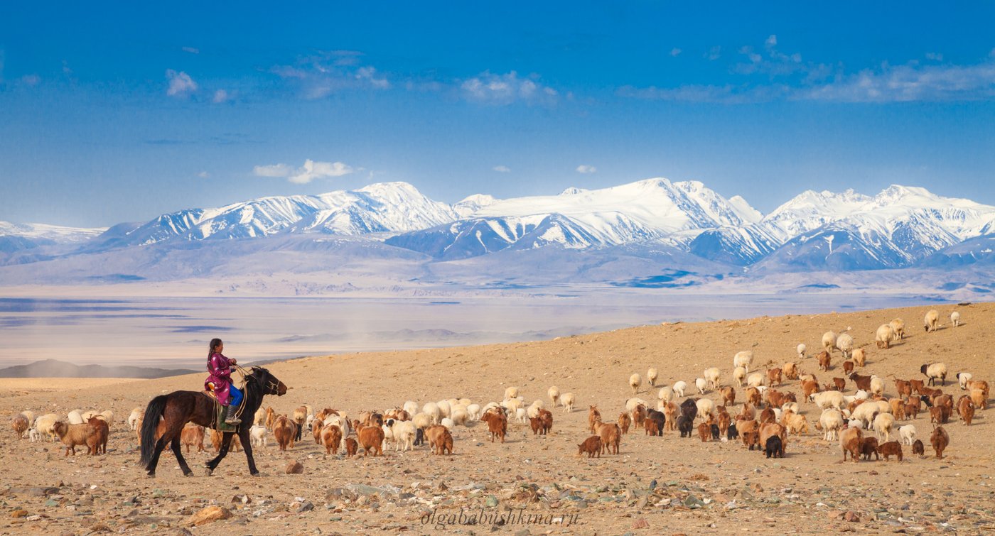 В Монголии многие до сих пор живут кочевым образом. Пасут скот, когда пастбища беднеют, откочёвывают на новое место. Молодая монголка гордо скачет на фоне горных отрогов Монгольского Алтая.