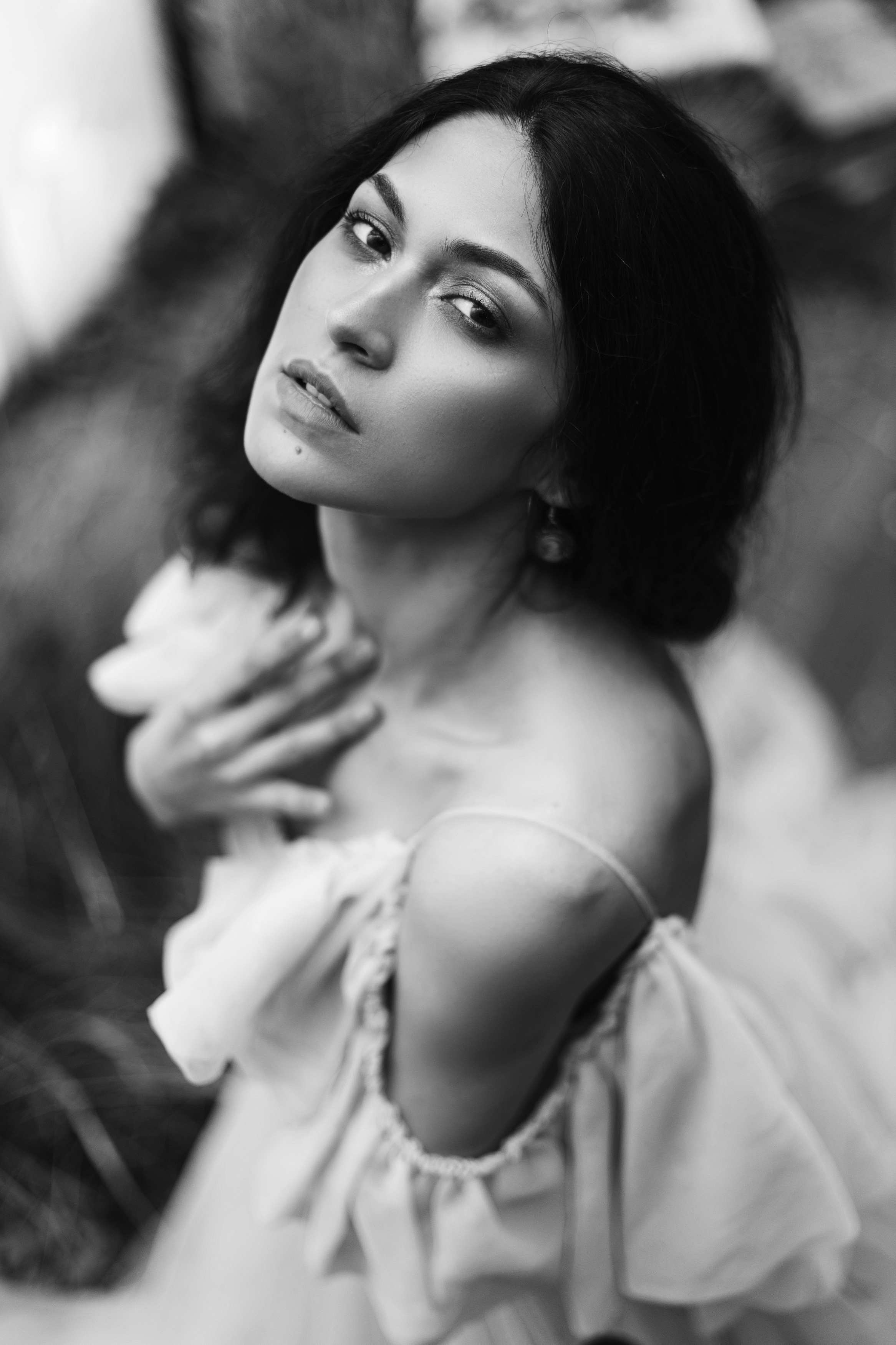 Ольга, красивый портрет. Чёрно-белая гамма подчёркивает текстуру кожи и ткани, поза и взгляд — выразительные. Мягкий фокус добавляет глубины. Могло бы быть чуть больше контраста, но в целом — сильная работа.
