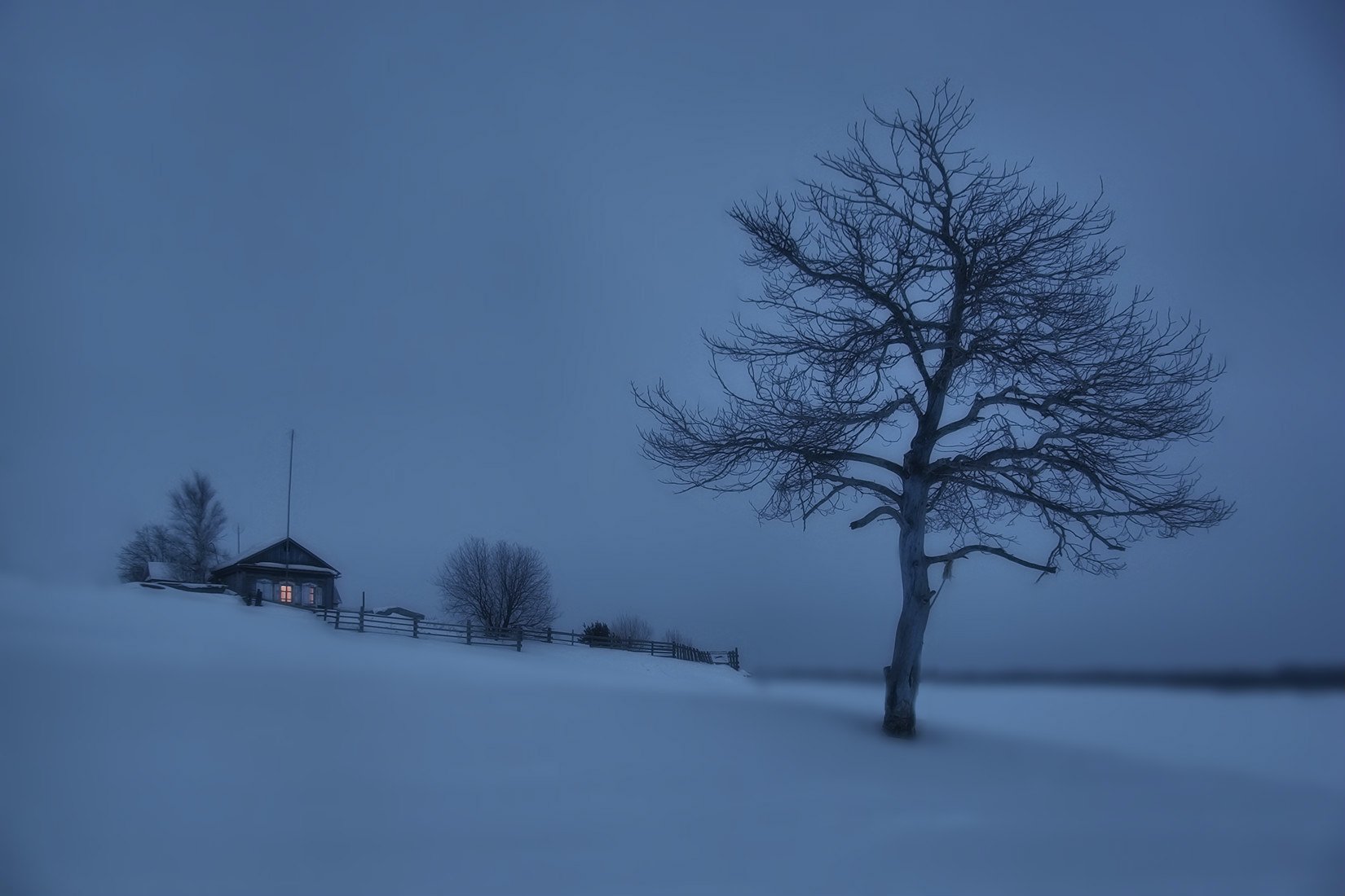 рискну посоветовать: создается впечатления завала вправо, хотя его нет, судя по полоске леса за деревом. Может поставить дерево вертикально и слегка повращать домик с околицей против часовой. И главное не трогая общий горизонт. А? В остальном то клево...