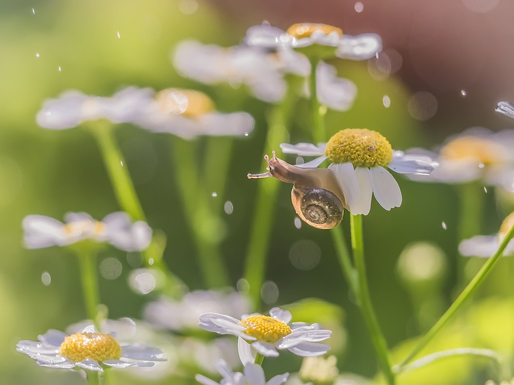 Очень хотелось передать на фото удивительную атмосферу макромира. Для этого пришлось тщательно выбирать ракурс и терпеливо ждать момент. . Они когда то были завезены в Карелию и теперь сильно размножились. И теперь после дождя можно увидеть «грозди» улиток на кустах и цветах.