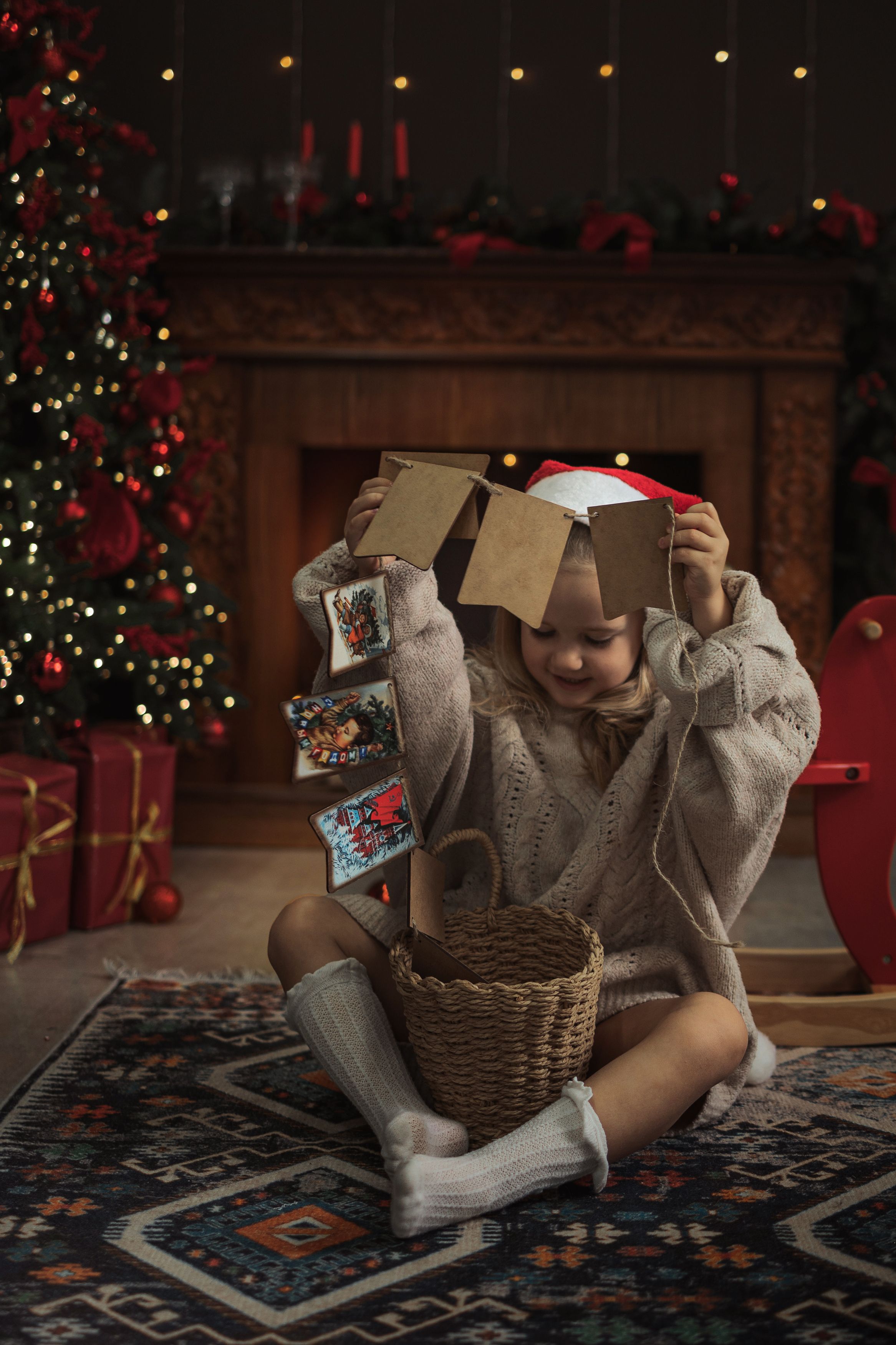 Светлана, ребёнок в свитере и шапке снеговика смотрит на карточки с улыбкой — это очень тёплое, живое и искреннее мгновение, которое сразу ведёт в атмосферу праздника 🌟.
