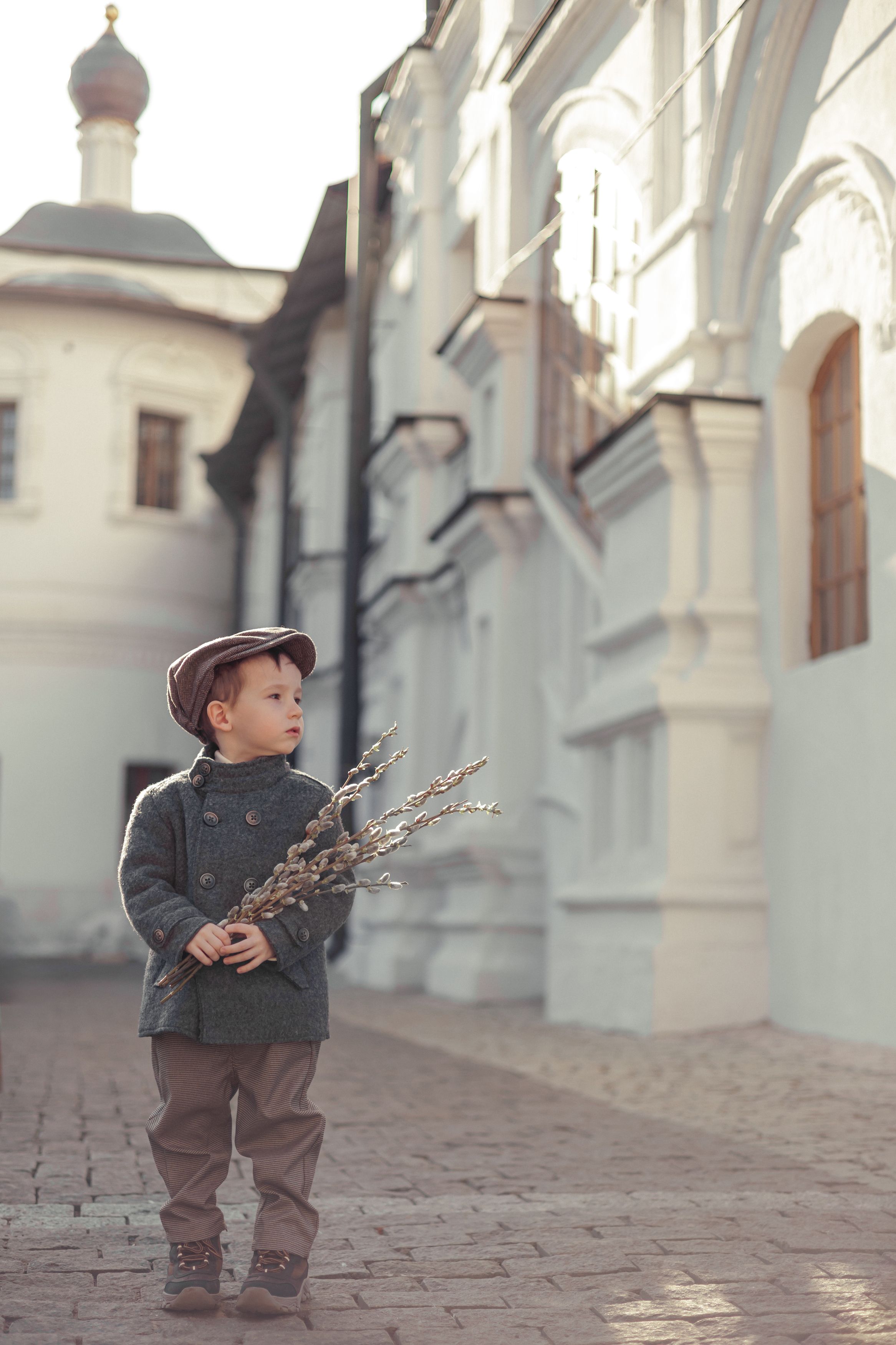 Светлана, спасибо за снимок. Деталь в руках — верба, это хорошо видно. Место — явно старинный городской переулок, с архитектурой, что подчёркивает настроение. Мальчик в тёмном пальто и шляпке, смотрит в сторону — как будто что-то замечает, но не говорит. Свет мягкий, утренний, вроде бы, — не бьёт в глаза, но хорошо ложится на стены и мостовую.