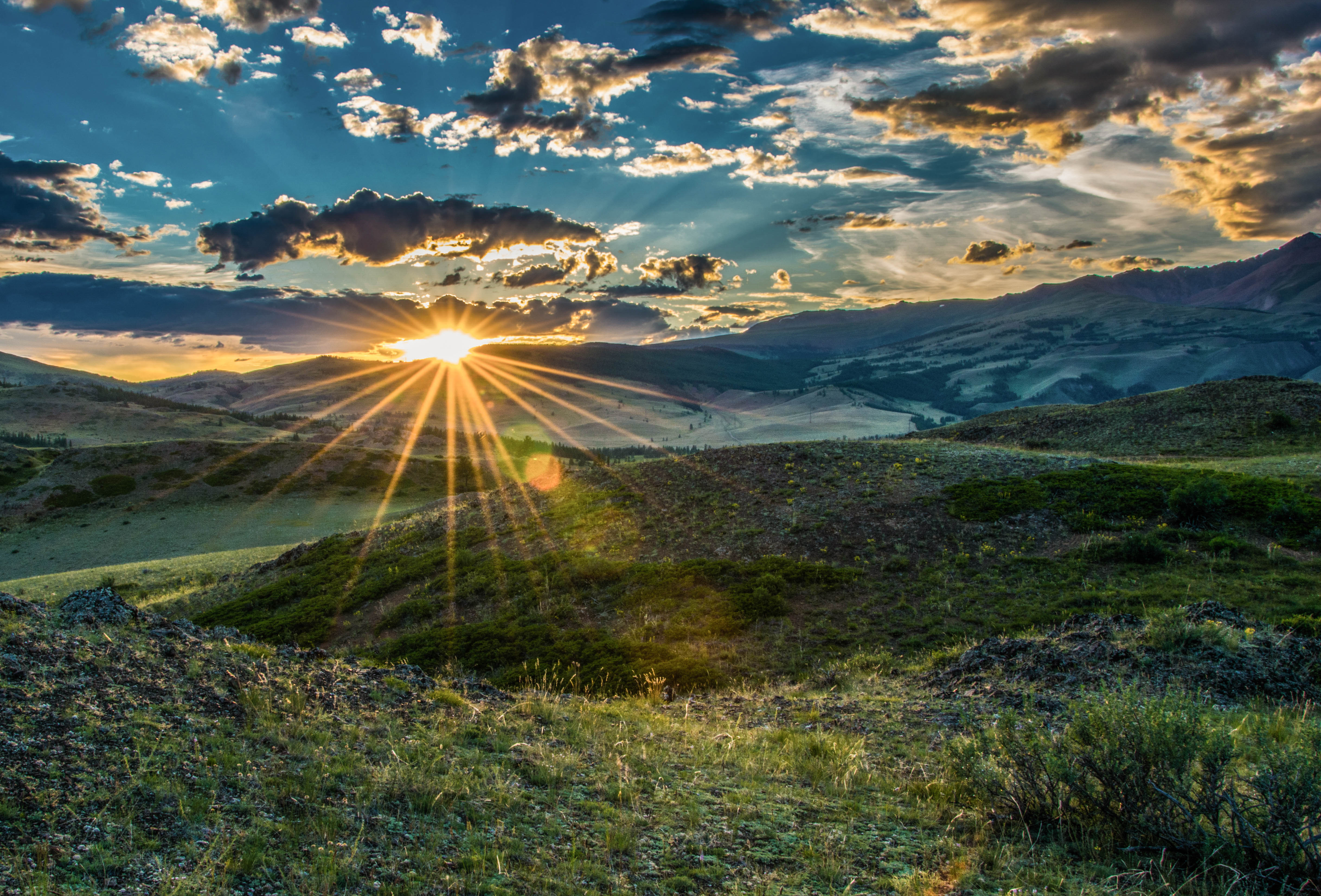 солнце, закат, вечер, небо, облака, горы, трава, Горный Алтай, Курай, лето, пейзаж, природа, Сергей Ослопов