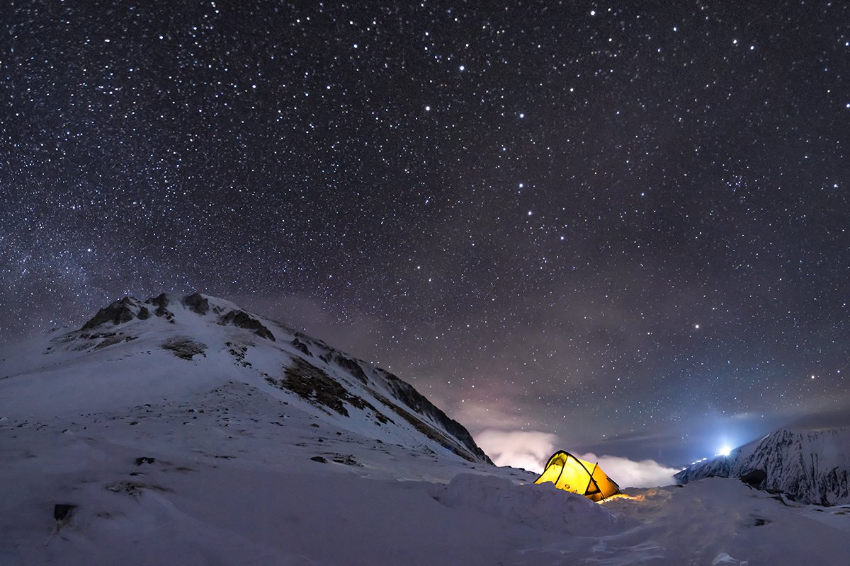 We couldn't reach the peak during the day due to bad weather... Glad that the sky was clear for a while during the night - just enough to take a quick shot. The peak on the left is Mt. Vihren in Pirin mountain, Bulgaria - 2914m.