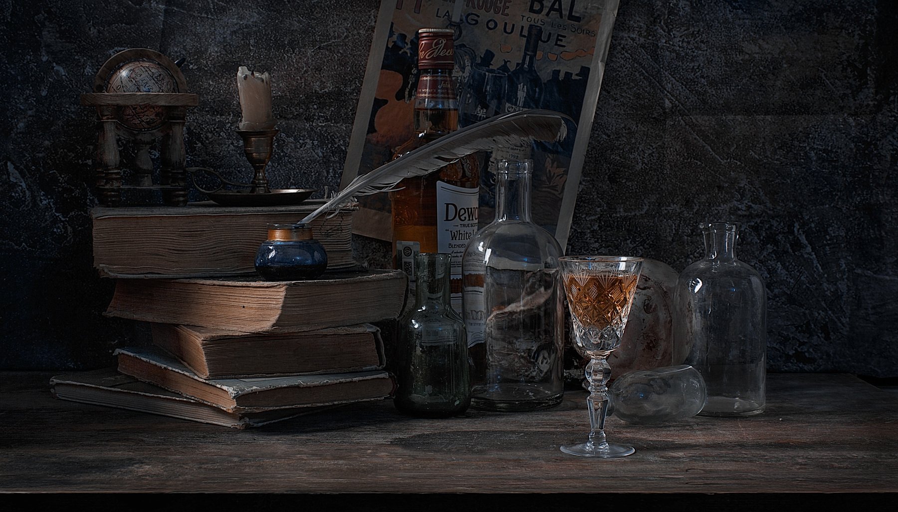 На мой взгляд - можно еще притушить задний план и немного подвигать и поразобрать стекло - там слишком много касаний. Я бы наверное еще свечку убрал или переставил вниз, чтобы прикрыть корешки книг