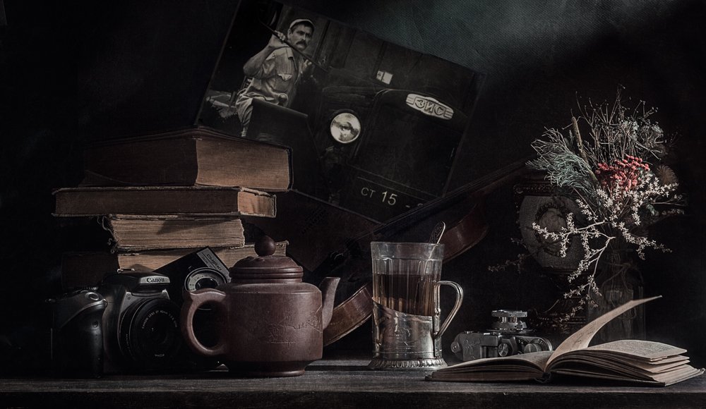Интересный натюрморт, только современный фотоаппарат выламывается из общего стиля.