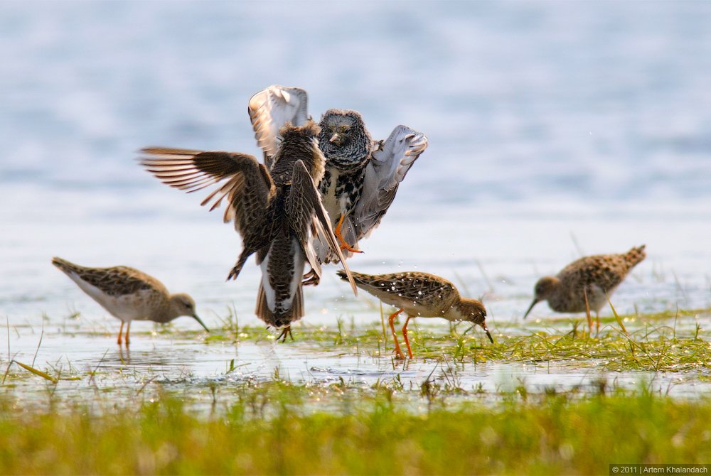 Днем самцы устраивают вот такие бои. Конечно стычки не такие грандиозные как те, которые начинаются уже непосредственно на местах гнездования. А заметный брачный воротник на шее еще не совсем отросший. Во всей своей красе он вырастает к моменту прилета в тундру.