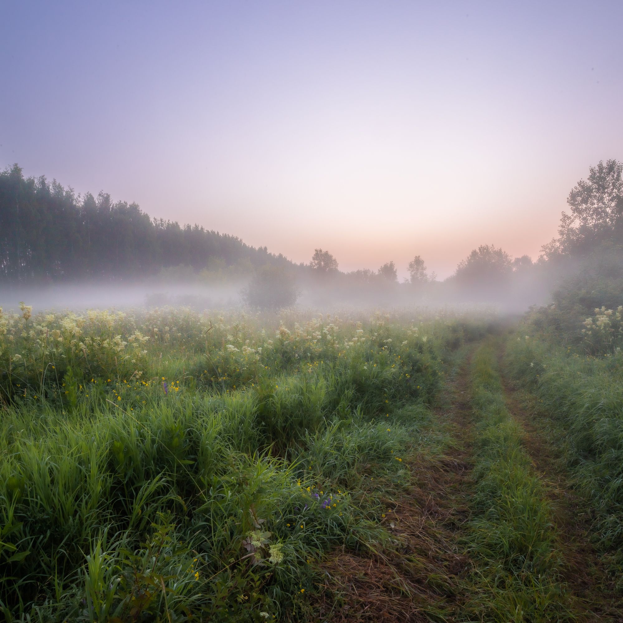туман, утро, рассвет, восход, небо, солнце, тепло, лето, июль, рано, ночь, поле, дорога, трава, цветы, ярко, Панагушин Сергей