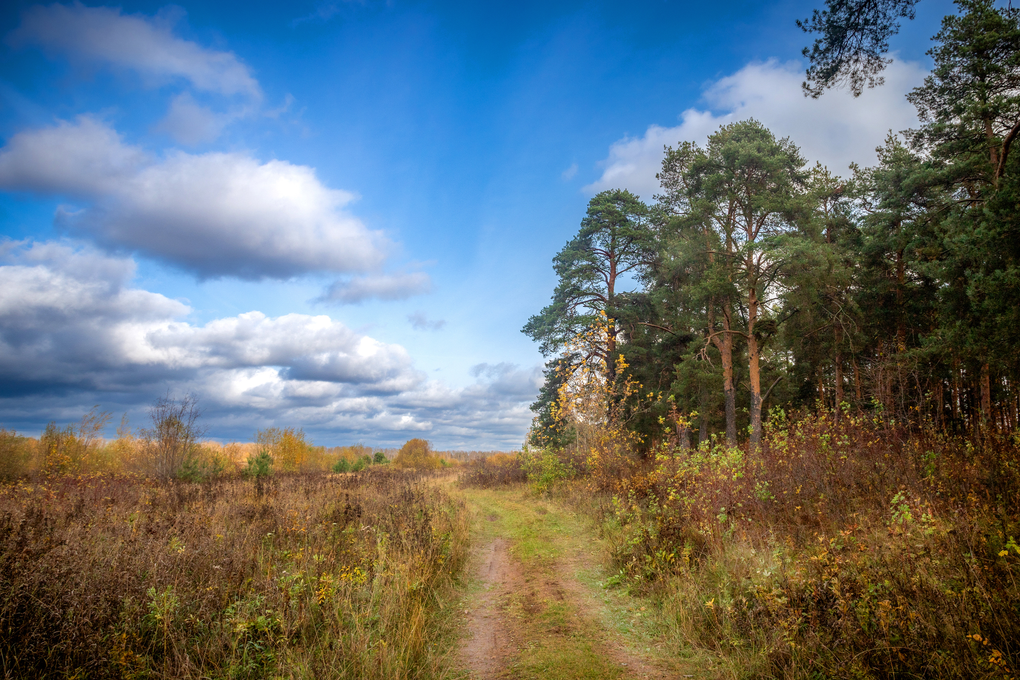 Киров, Вятка, осень, парк, лес, солнце, дорога, поле, сосна, деревья, небо, облака, картина, Панагушин Сергей